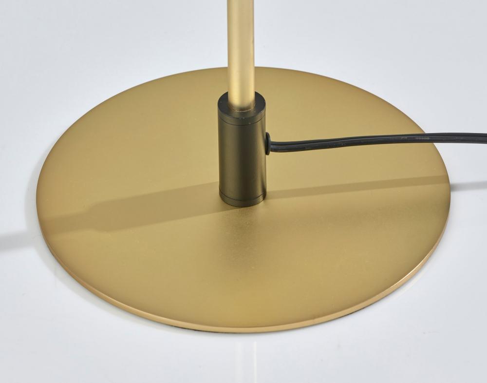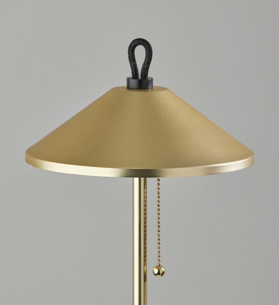 In classic form, the Kaden floor lamp's mixed metal finish and elegant design adds a polished accent to your space. Featuring a slim round base, thin pole and tapered conical shade, the dual-metal design is crafted with a brass finish and beautifully contrasting black metal accents. Two 5W replaceable LED bulbs are included and illuminate your space with 450 lumens of warm light. A pull-chain switch in brass finish easily turns the light on or off, while the lamp is powered by a black fabric-covered cord. The Kaden floor lamp is also available with a black metal finish and brass accents. Complete your decor with the coordinating Kaden table lamp.