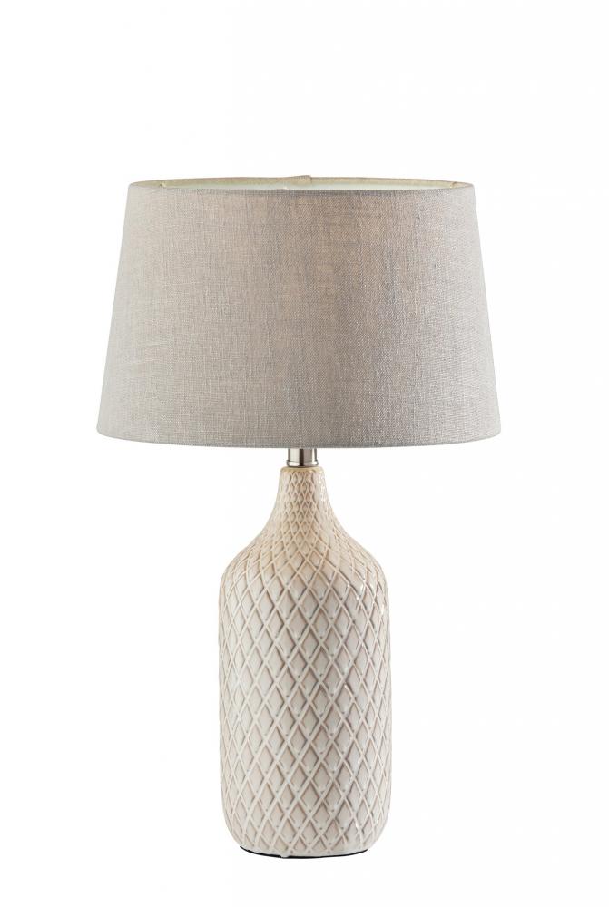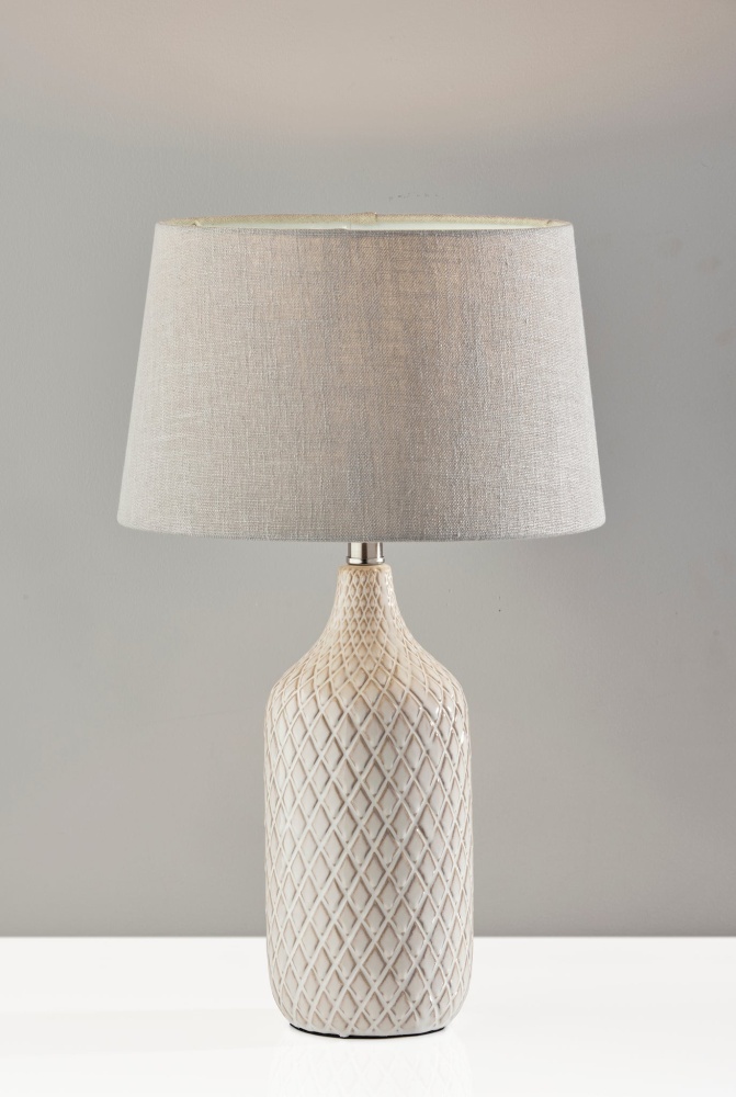 The Kathryn 2-piece table lamp set by Simplee Adesso illuminates your space with bold texture and dimension with its jug-shaped ceramic base featuring a stylish diamond pattern. With off-white, grey, and natural colored tones, the 22.75" tall lamps feature 5.75" diameter textured ceramic bases that are complimented by taupe textured fabric drum shades. Each table lamp operates a 100W bulb (not included) that is easily turned on or off with a rotary socket switch. The set of two table lamps is ideal for framing your bed or other furniture or for balancing a console table design. Change it up by separating the pair to tie different room designs together.