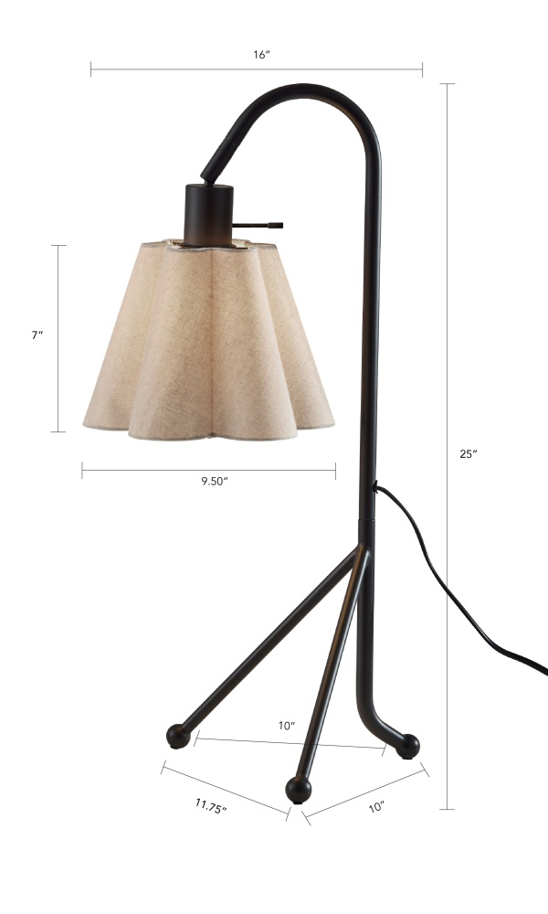 Introducing the 9408-01 Kendra Table Lamp, a stylish and versatile lighting solution that combines modern design with classic charm. Featuring a sleek black finish and a scalloped oatmeal linen fabric shade, this lamp adds elegance and warmth to any room. Standing at 25 inches tall, it’s perfect for bedside tables, desks, or living room accents. The curved tripod base adds a unique architectural touch, enhancing its stability and aesthetic appeal. Equipped with a 40W on/off rotary socket switch, the Kendra Table Lamp is both functional and fashionable.