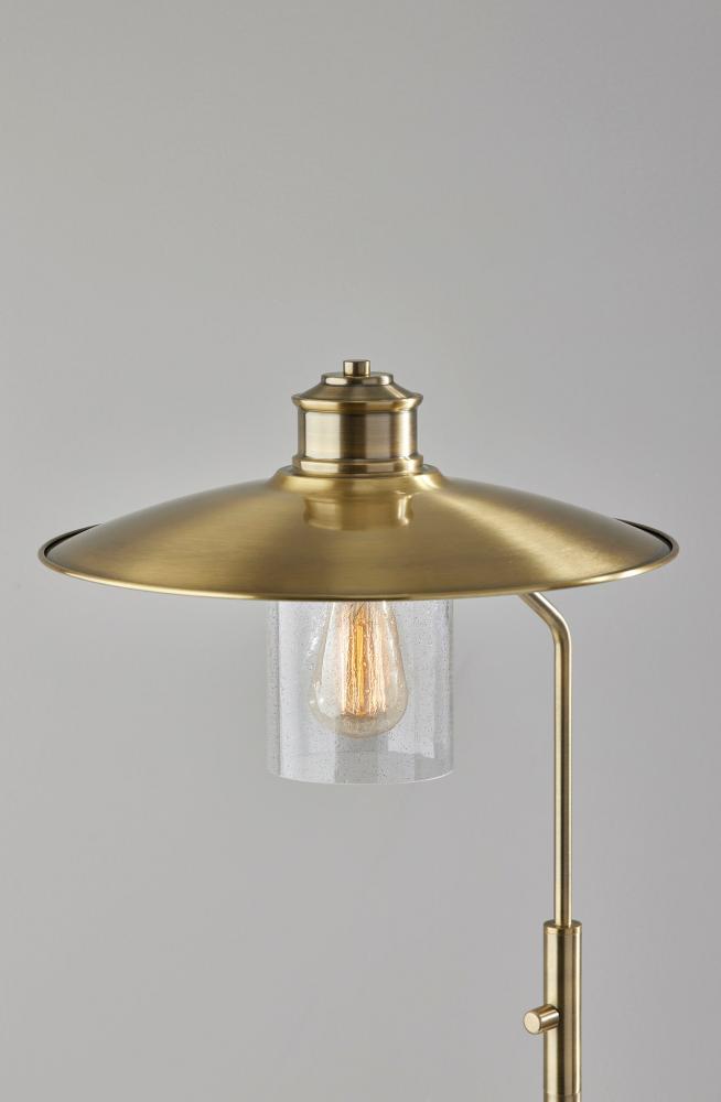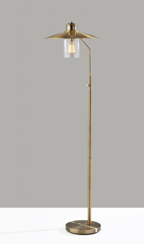 Brighten your space with the metallic warmth and elegant styling of the Kieran floor lamp. Its antique brass finish and clear seeded glass shade complement both pared-down styling and ornately detailed looks. Constructed of monochrome antique brass, the lamp features a 10" diameter round base supporting a narrow tube. Topping the light's shade is a classically embellished antique brass dome above a cylindrical glass piece made of seeded clear glass. The glass shade leaves the included 40W vintage Edison bulb visible for a striking look. Complete your decor with the coordinating Kieran wall lamp, desk lamp, and pendant light.