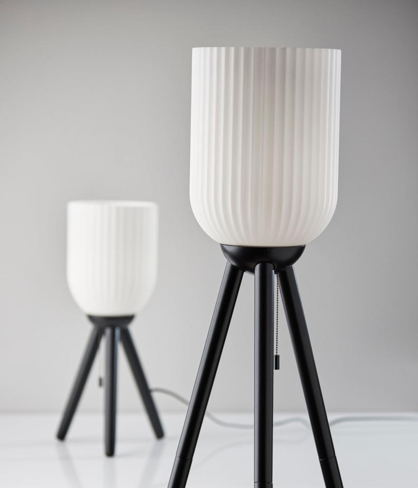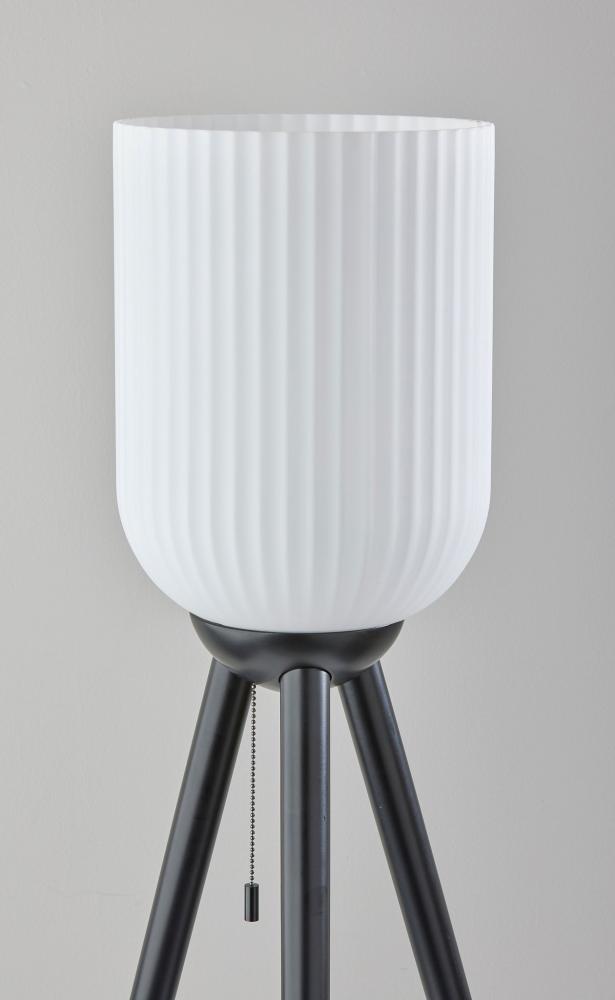 Illuminate your space with the Kinsley floor lamp's stunning mix of materials and geometries. A black wood tripod base supports a tall, cylindrical glass shade. The frosted ribbed glass softly disperses the light from a 100W bulb outward. The lamp is easily turned on or off with a pull chain switch suspended from the base of the glass shade. To complement coastal or farmhouse styling, the floor lamp is also available with a natural wood base. Complete your decor with the coordinating Kinsley table lamp.