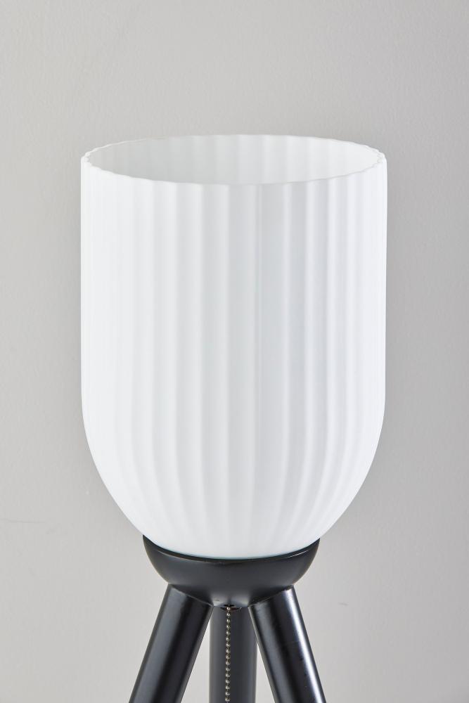 Illuminate your space with the Kinsley table lamp's stunning mix of materials and geometries. A black wood tripod base supports a tall, cylindrical glass shade. The frosted ribbed glass softly disperses the light from a 60W bulb outward. The lamp is easily turned on or off with a pull chain switch suspended from the base of the glass shade. To complement coastal or farmhouse styling, the table lamp is also available with a natural wood base. Complete your decor with the coordinating Kinsley floor lamp.