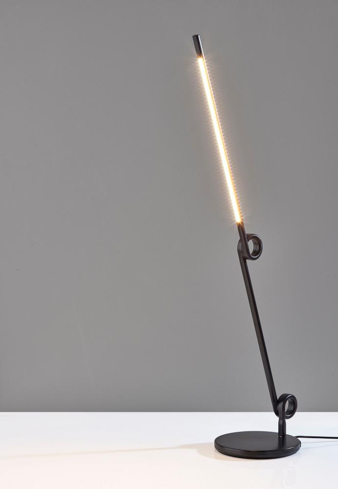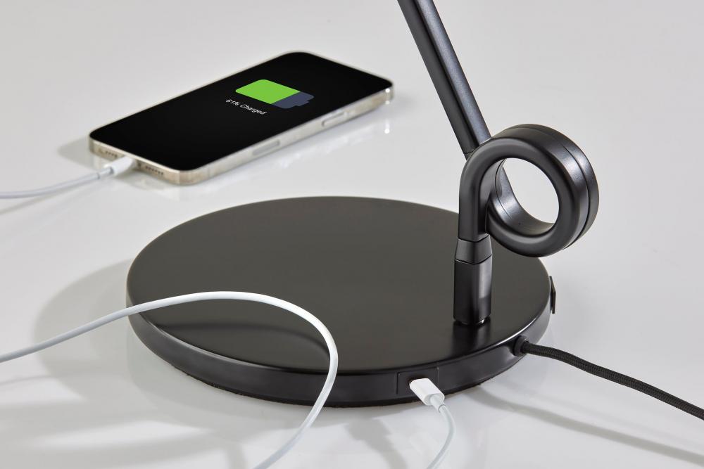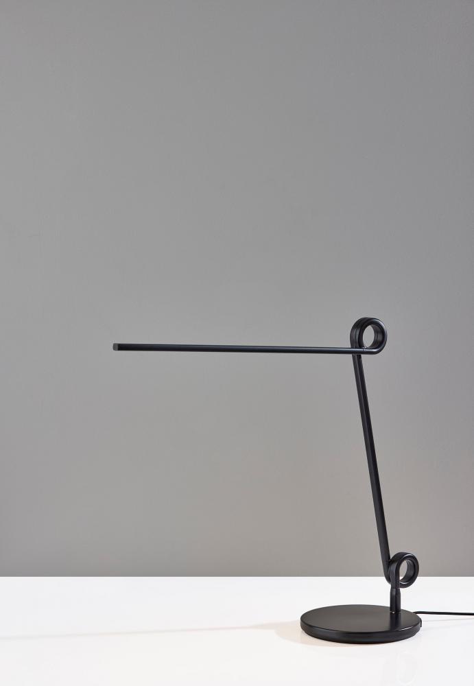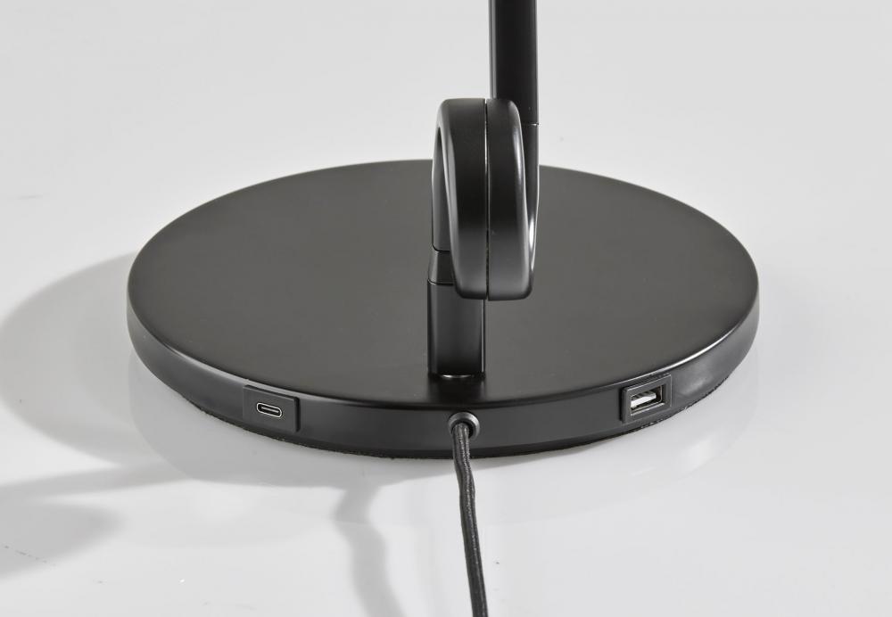 Bring a unique visual impression to your desk with the contemporary Knot LED lamp. The round base and thin tube in black finish present clean lines that are accented by decorative flourishes at each of the two inflection points. The direction and height of the light can be adjusted at these points, allowing you to direct the light wherever it's needed. The long, narrow integrated LED brightens any space with 650 lumens diffused through a frosted shade, while the 3,000K color temperature adds a touch of warmth and intimacy. A discreet 4-way touch switch adjusts the brightness between low, medium, high, and off, allowing you to select the perfect lighting level for your needs. For simultaneous charging of multiple devices right from your desk, USB and USB-C ports are conveniently located at the back of the lamp base. A black fabric-covered cord completes the monochrome design. For a brighter look, the desk lamp is also available in white. Complete your decor with the coordinating Knot LED floor lamp.