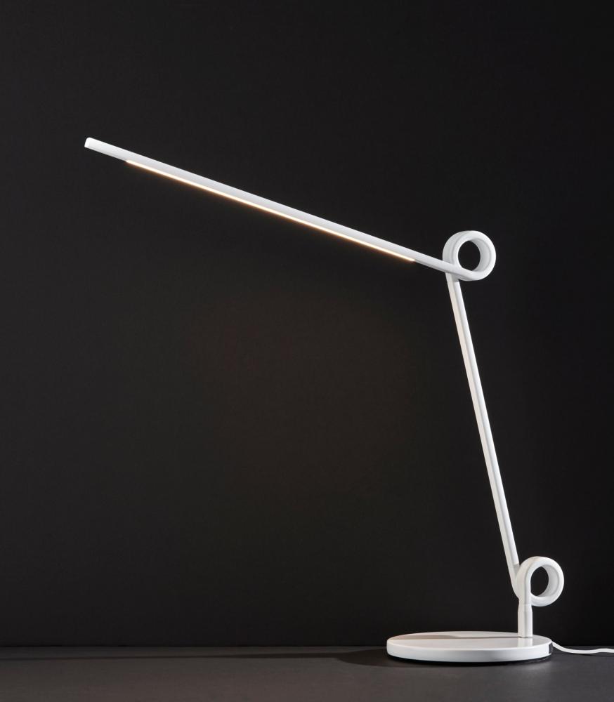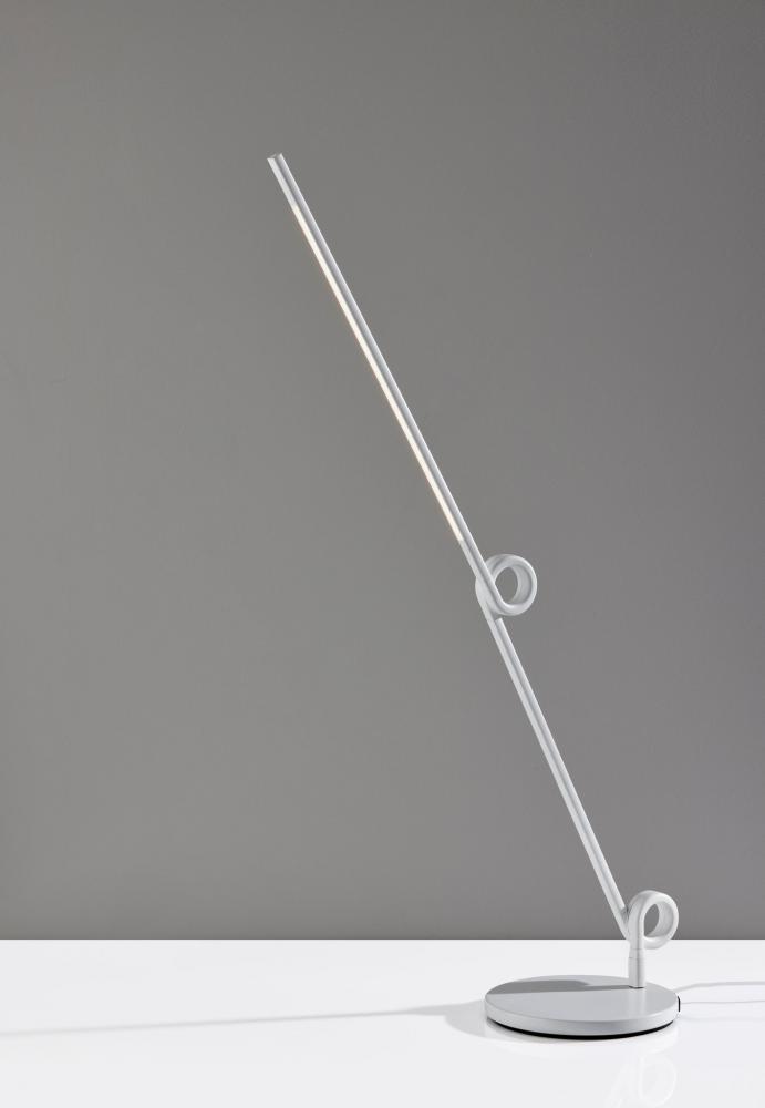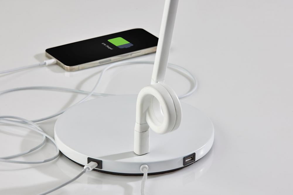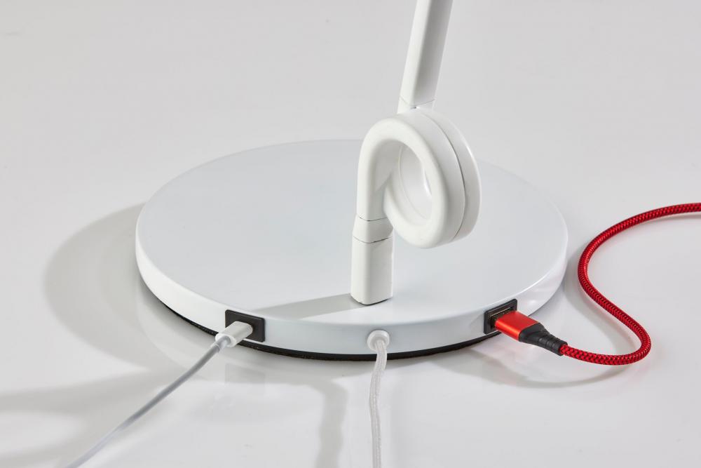 Bring a unique visual impression to your desk with the contemporary Knot LED lamp. The round base and thin tube in white finish present clean lines that are accented by decorative flourishes at each of the two inflection points. The direction and height of the light can be adjusted at these points, allowing you to direct the light wherever it's needed. The long, narrow integrated LED brightens any space with 650 lumens diffused through a frosted shade, while the 3,000K color temperature adds a touch of warmth and intimacy. A discreet 4-way touch switch adjusts the brightness between low, medium, high, and off, allowing you to select the perfect lighting level for your needs. For simultaneous charging of multiple devices right from your desk, USB and USB-C ports are conveniently located at the back of the lamp base. A white fabric-covered cord completes the monochrome design. The desk lamp is also available in black finish to complement industrial or modern stylings. Complete your decor with the coordinating Knot LED floor lamp.
