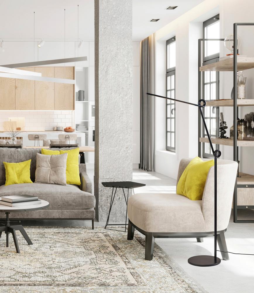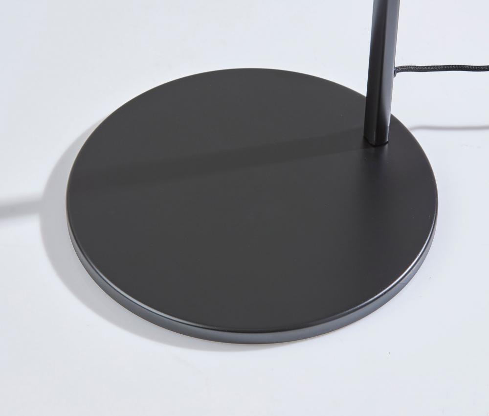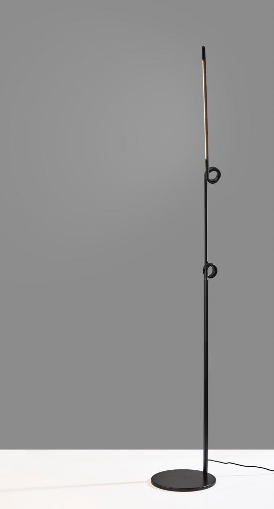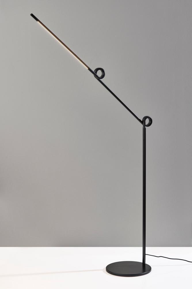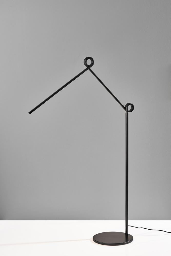 Bring a unique visual impression to your space with the contemporary Knot LED floor lamp. The round base and thin tube in black finish present clean lines that are accented by decorative flourishes at each of the two inflection points. The direction and height of the light can be adjusted at these points, allowing you to direct the light wherever it's needed. Whether it is positioned to be tall and narrow for a room corner or angled for accent lighting behind sofas or recliners, this floor lamp is the ideal choice for any sized space. The long, narrow integrated LED brightens any room with 650 lumens diffused through a frosted shade, while the 3,000K color temperature adds a touch of warmth and intimacy. A discreet 4-way touch switch adjusts the brightness between low, medium, high, and off, allowing you to select the perfect lighting level for your needs. A black fabric-covered cord completes the monochrome design. For a brighter look, the floor lamp is also available in white. Complete your decor with the coordinating Knot LED desk lamp.