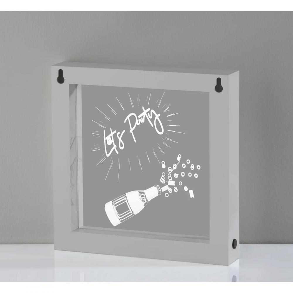 This abstract Lets Party Video Light Box by Simplee Adesso speaks for itself! The Lets Party motto and champagne bottle art are illuminated in white LED light on this piece that can be wall mounted as eye-catching wall art or can stand free on tables, shelves, nightstands, or counters. Measuring 9" tall by 9.25" wide including a silver plastic frame, this light box includes a 7.25" square window with art illuminated in white LED light. The light can be easily turned on or off with a push button switch. The 0.3W LED can be powered by either 3 "AA" batteries (not included) for a clean, wire-free aesthetic. Alternatively, the light box can be powered using the included 8' USB cable for unlimited use without needing to worry about replacing batteries.