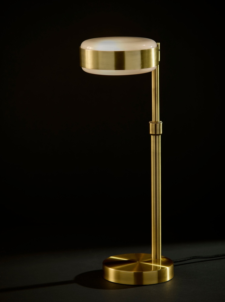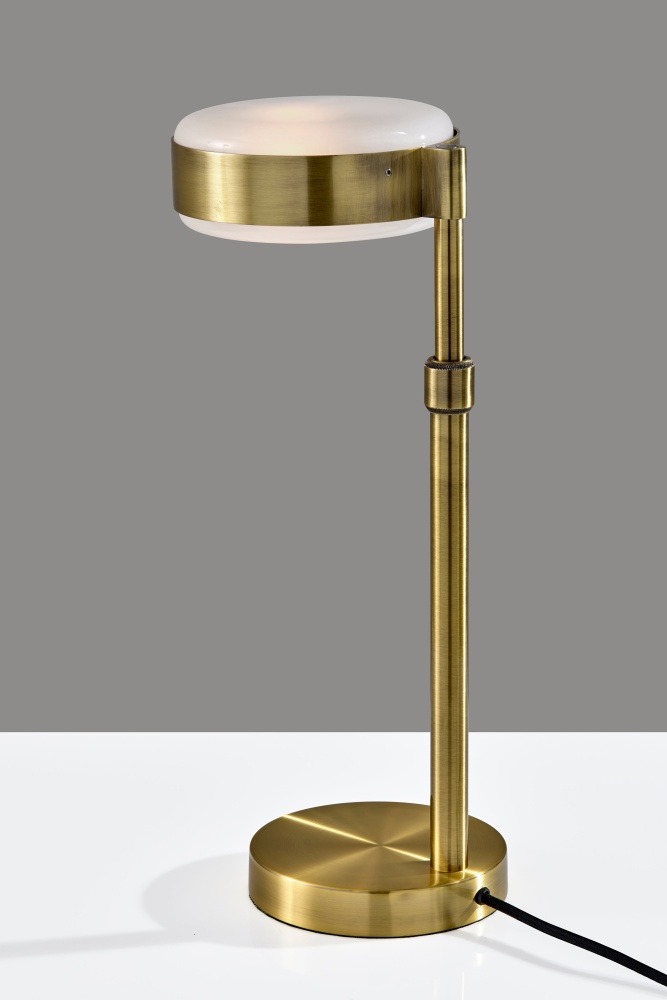 Introducing the AD9104-21 Linis Table Lamp, a sleek and modern addition to your home decor. Featuring a timeless antique brass finish and a unique white glass shade, glossy on the outside and frosted on the inside, this lamp creates a soft and inviting glow. With an adjustable height ranging from 17" to 24", it offers versatile functionality to fit any space. The convenient on/off touch switch located on the top of the pole provides effortless control, making it the perfect blend of style and practicality for any room in your home.