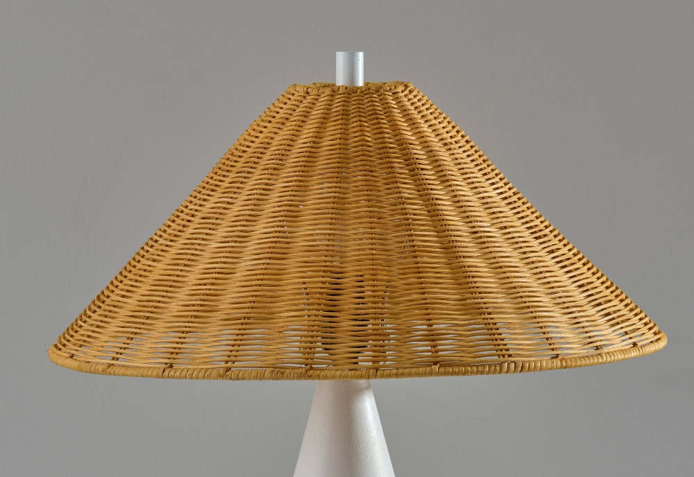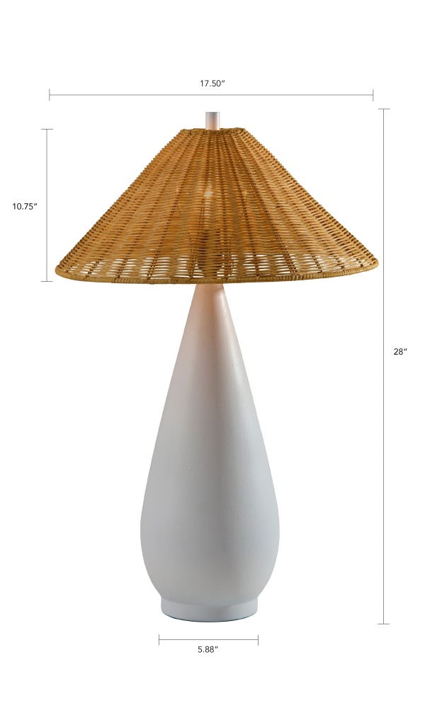 Introducing the 9405-02 Lorelei Table Lamp, a stylish combination of natural textures and contemporary design. This lamp features a rough-finished white ceramic base that adds a touch of rustic elegance to your space. The tapered brown rattan shade complements the base with its organic texture, casting a warm and inviting light. Standing at 28 inches tall, this lamp is perfect for enhancing living rooms, bedrooms, or entryways. Equipped with a 100W on/off rotary socket switch, the Lorelei Table Lamp effortlessly blends functionality with timeless style.