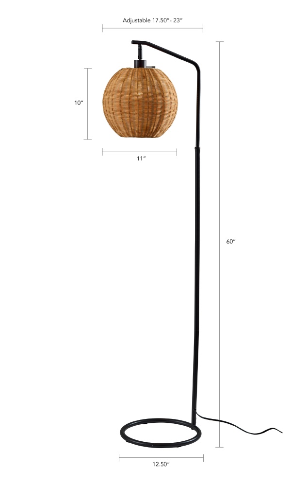 Introducing the 9407-01 Maeve Floor Lamp, a striking combination of modern design and natural texture. With a sleek black finish and an open ring metal base, this lamp offers a bold yet elegant aesthetic that elevates any room. The globe-shaped brown rattan shade adds warmth and organic charm, casting a soft and inviting glow. Standing tall at 60 inches, the Maeve Floor Lamp is perfect for illuminating living rooms, bedrooms, or reading nooks. Equipped with a 100W on/off rotary socket switch, it seamlessly blends style and functionality for versatile lighting.
