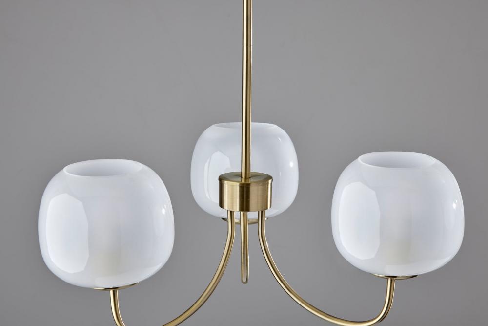 Introducing the 394-21 Magnolia Chandelier, an exquisite and versatile lighting fixture that seamlessly merges classic aesthetics with modern functionality. This chandelier features a Brass finish that infuses timeless charm and sophistication into your decor. Its three glass shades are a study in contrast, with glossy white exteriors for a contemporary twist, while the frosted interiors diffuse a soft and inviting glow. The Magnolia Chandelier comes with two extra 8-inch poles, allowing you to customize the lamp's height to perfectly match your ceiling height. With gracefully curved arms, this chandelier creates a captivating focal point in any room. Designed for effortless integration into your space, this chandelier offers a touch of nostalgia and refinement while providing both focused and ambient illumination. The Magnolia Chandelier is a sophisticated choice for enhancing the ambiance and visual appeal of your interior.