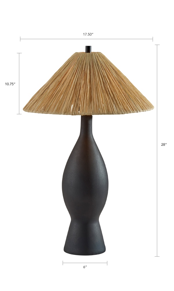 Introducing the 9404-01 Maren Table Lamp, a striking blend of natural texture and modern design. Featuring an hourglass-shaped rough-finished black ceramic base, this lamp adds a bold, rustic touch to any room. The tapered raffia grass shade complements the base with its organic texture, creating a warm, inviting glow. Standing at 28 inches tall, it's the perfect addition to living rooms, bedrooms, or entryways. Equipped with a 100W on/off rotary socket switch, this lamp offers both style and functionality for your lighting needs.