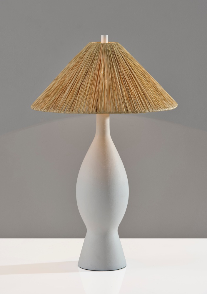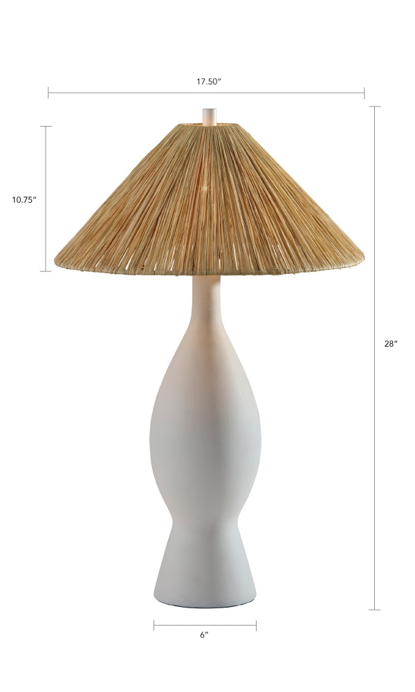 Introducing the 9404-02 Maren Table Lamp, a perfect blend of organic textures and contemporary design. Featuring an hourglass-shaped rough-finished white ceramic base, this lamp brings rustic elegance to any space. The tapered raffia grass shade enhances the natural aesthetic, casting a warm and inviting glow in your room. Standing at 28 inches tall, the Maren Table Lamp is an ideal addition to living rooms, bedrooms, or entryways. Equipped with a 100W on/off rotary socket switch, it provides a functional yet stylish lighting solution.