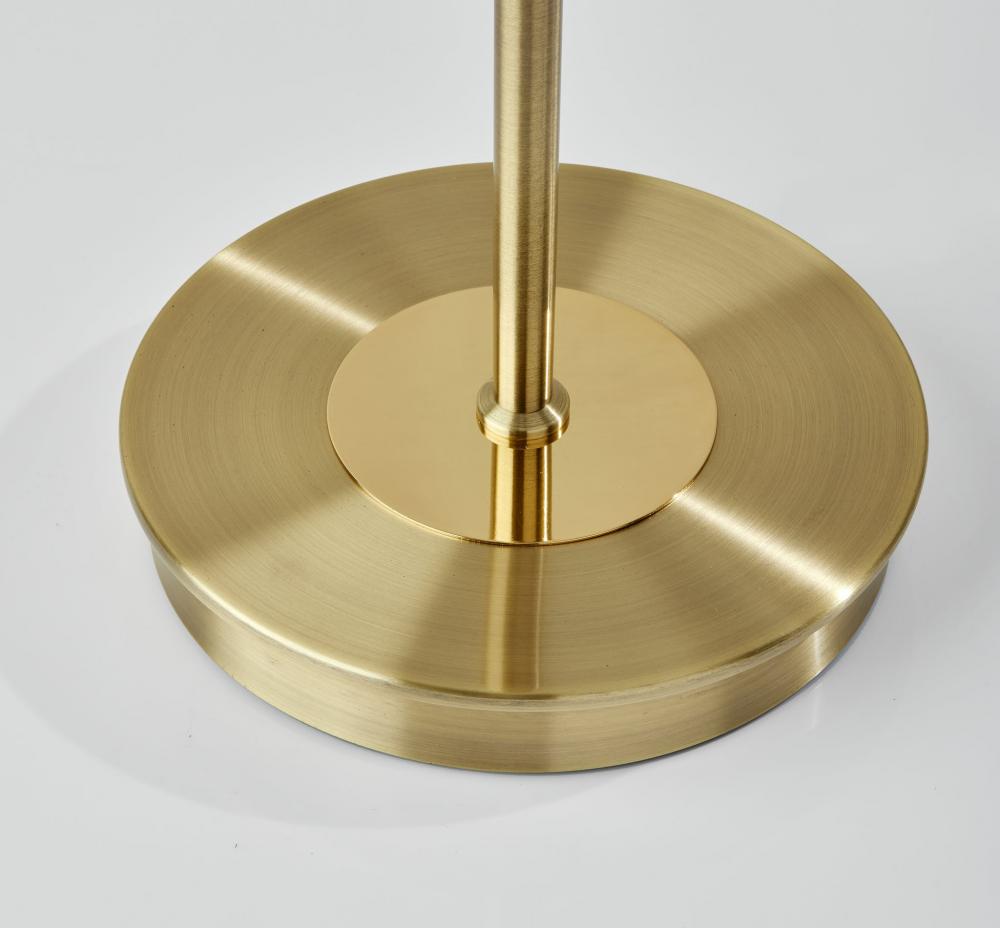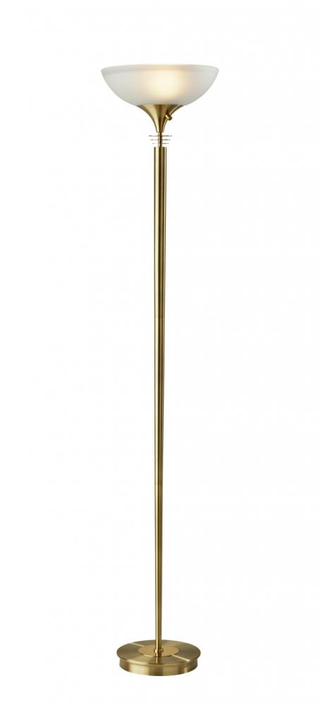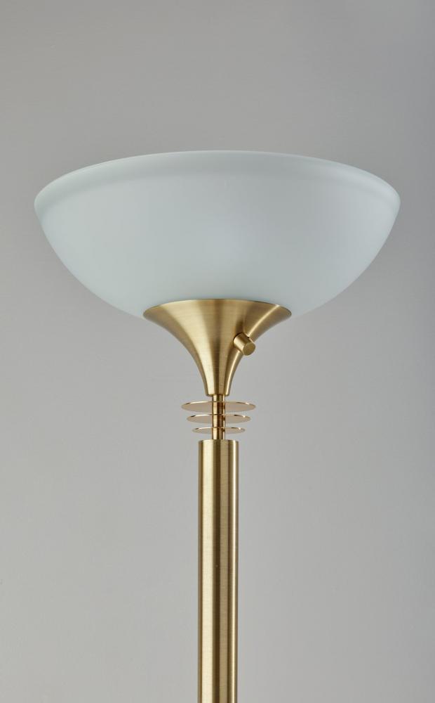 Modern, polished, and elegant, the Metropolis torchiere upgrades the standard torchiere silhouette to highlight small details and sleek form. Beautiful in warm, brushed antique brass, this lamp's 10" round base features a polished brass ring. The slender, simple stem is topped with three circular accents for an elegant look. Topping the torchiere is a 14" diameter frosted glass shade to house two 150W bulbs, bringing a soft glow to any space. For versatile lighting options, the brightness can be adjusted between high, low, and off with the rotary switch located at the base of the shade.