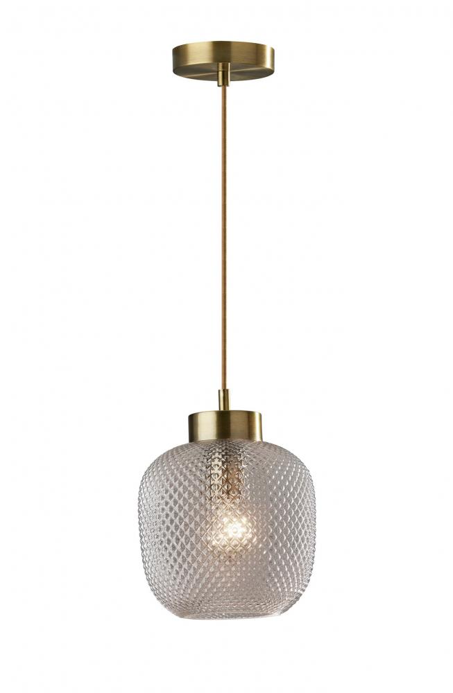With a skillful blend of metal and textured glass, the Natasha pendant light elevates any space with contemporary style. Hang this pendant by itself or pair it with several more to create a stunning effect and add illumination to your bathroom, living room, dining room, or entryway. With a 6? beige fabric-covered cord, the height of the light can be adjusted to suit the needs of any room regardless of the ceiling height, making it a must-have addition to any space. The 5" diameter round ceiling mount in antique brass finish supports the glass shade, while the shade is crafted of clear textured glass that brings warmth to your room by softly diffusing the light from a 100W bulb. Complete your decor with the coordinating Natasha wall lamp, floor lamp, and table lamp.