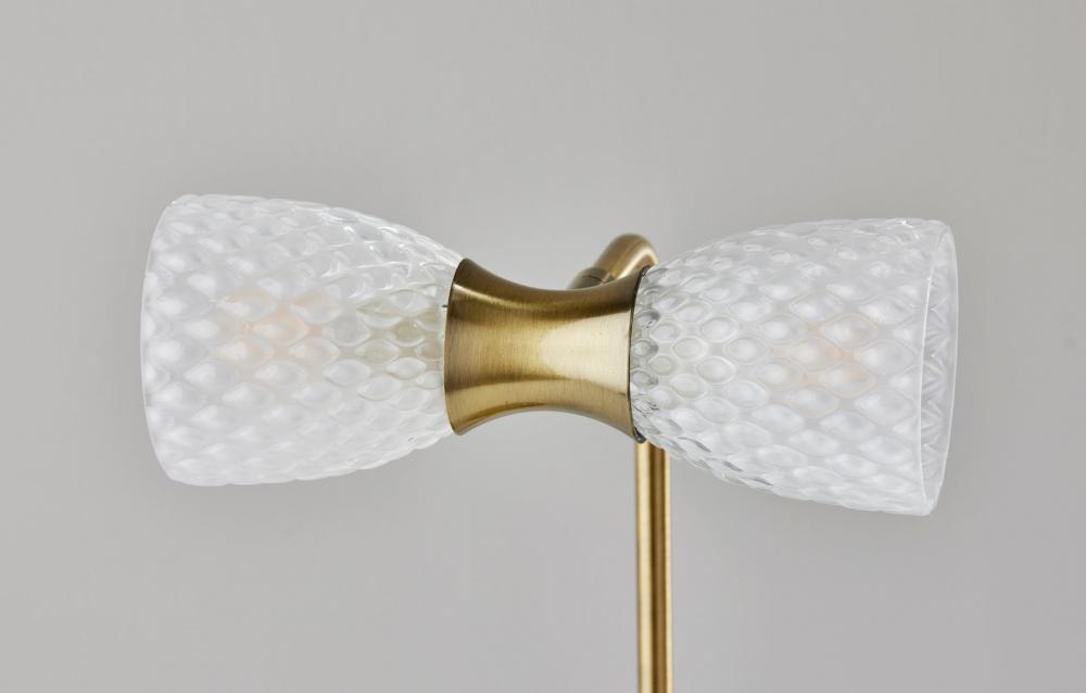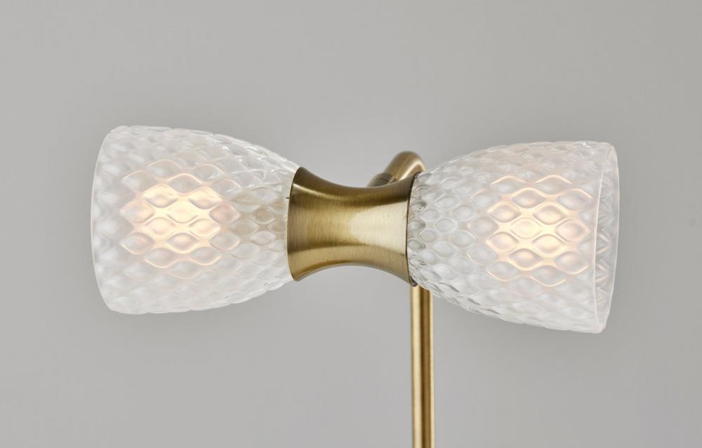 Brighten your space with the style and functionality of the Nina LED desk lamp. Crafted with an antique brass finish and featuring delicate glass texturing, this lamp complements Victorian or farmhouse decor. A 7" diameter round base supports a narrow matching stem. Suspended from the stem are dual textured milk glass shades that are connected with an hour-glass shaped accent piece in antique brass finish. The two included 3W replaceable LED bulbs throw a soft, warm white light and are compatible with full-range dimmers, allowing you to adjust the brightness as needed for either task lighting or an accent light. For added versatility, the base of the lamp shade features an articulation point, allowing you to rotate and redirect the shade for a variety of looks and lighting options. Complete your decor with the coordinating Nina LED wall lamp and floor lamp.