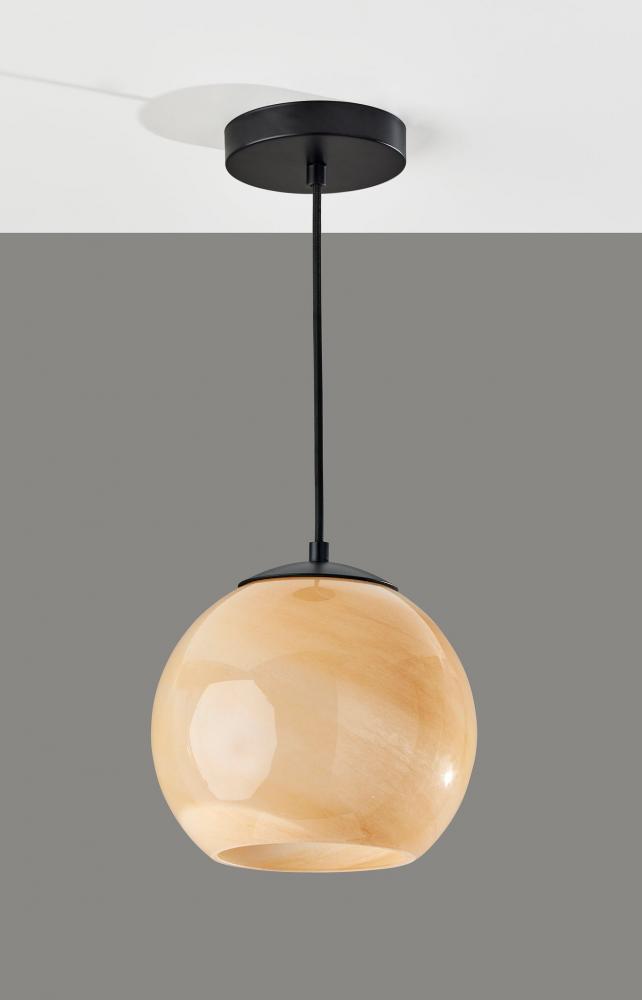 Add warmth and timeless style to your space with the Nolan pendant light. A round 5" diameter base crafted of black metal supports a stunning glass globe with an eye-catching beige swirl pattern that throws warm light from a 60W bulb. Hang it by itself or pair it with several more to create a stunning effect and add illumination to your kitchen, dining area, bedroom, or bathroom. With a 6? black fabric-covered cord, the height of the light can be adjusted to suit the needs of any room regardless of the ceiling height. Complete your decor with the coordinating Nolan desk lamp, floor lamp, arc floor lamp, wall lamp, and flush mount ceiling light.