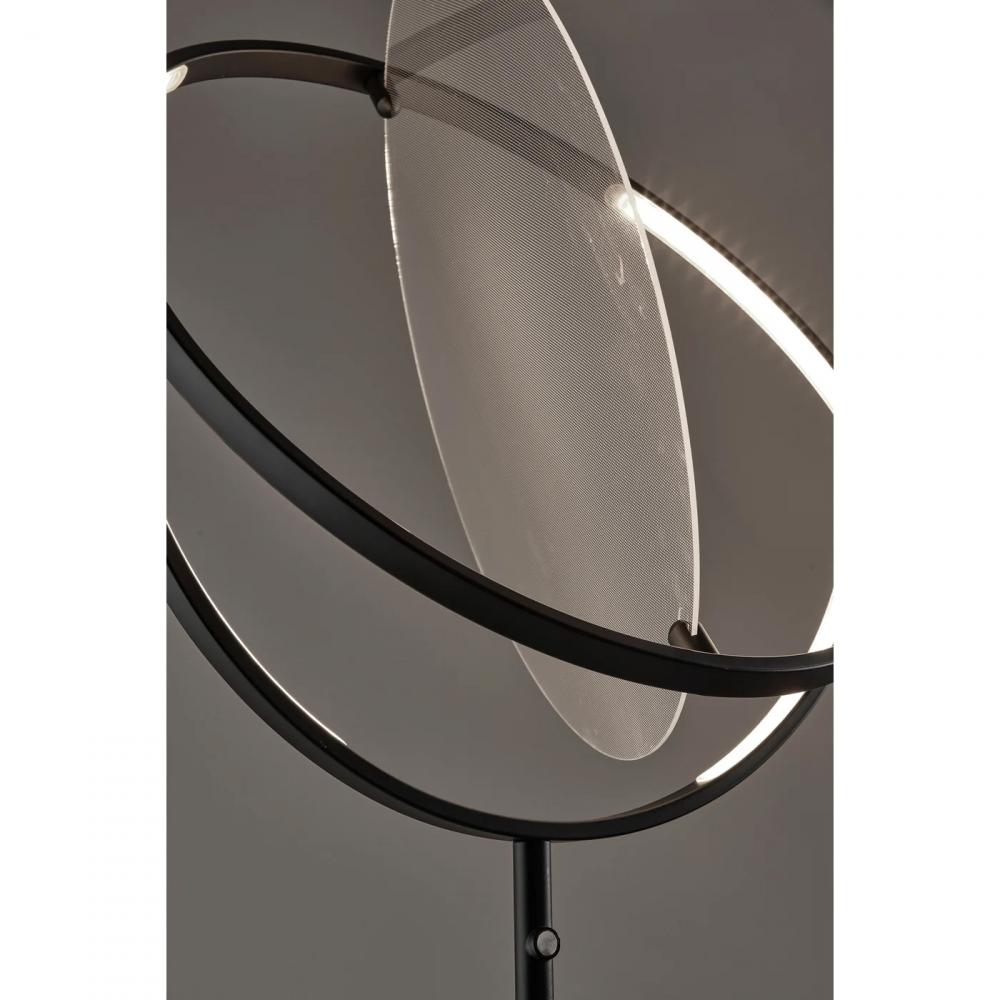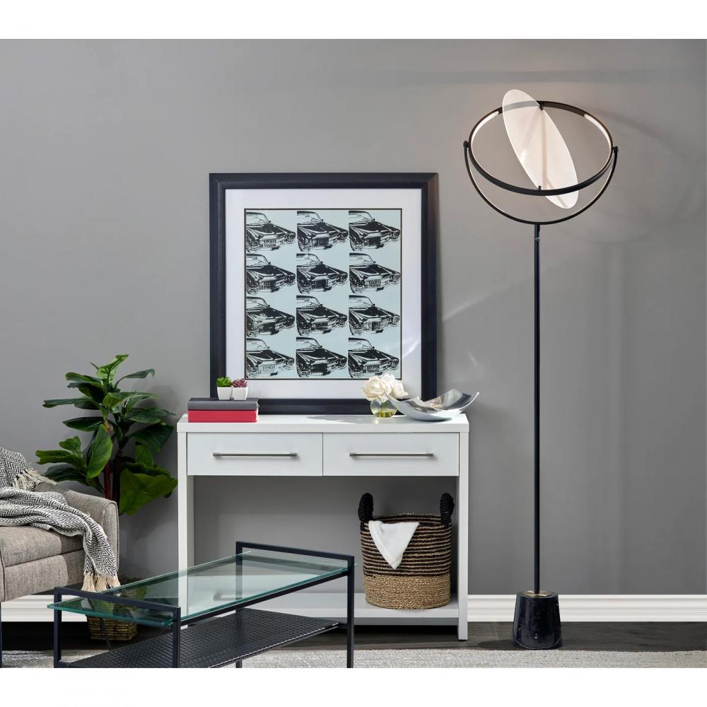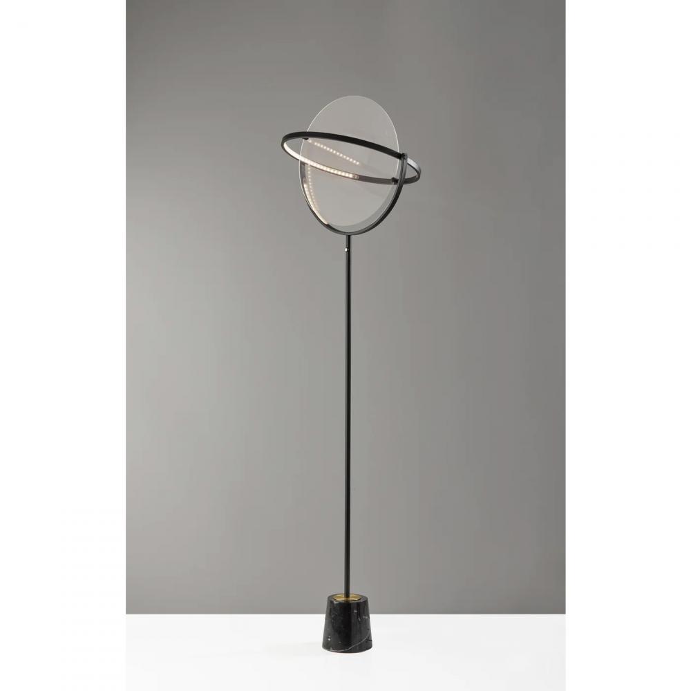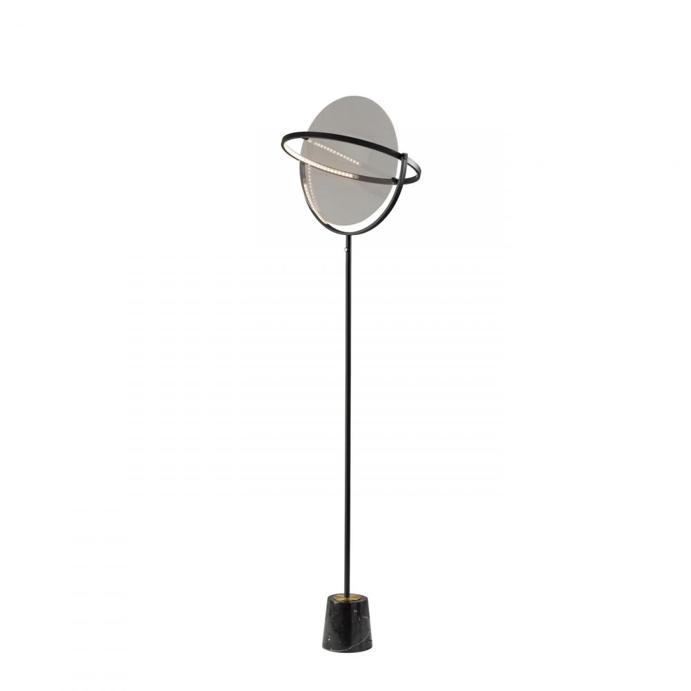 Elevate your room with a modern lamp that blends artistry and function. The 77.5" tall Orsa LED floor lamp by ADS360 is an adjustable lighting option that will become a statement piece in your home. It features a large, metal disc-shaped LED frame measuring 19.5" in diameter that can be rotated to create the perfect lighting effect for your space. Suspended inside the metal frame is an 18" diameter frosted diffuser to softly disperse the integrated 1,000 lumen LED lighting. Below the disc-shaped frame is a long, slender pole in black finish leading to the luxurious black marble cylindrical base topped with an antique brass disc. The 20W floor lamp is operated with a touch switch located on the stem, allowing you to change the lighting setting between low, medium, high, and off at the touch of a finger, and features a 5' black cord. Complete your décor with the coordinating Orsa table lamp and pendant light.