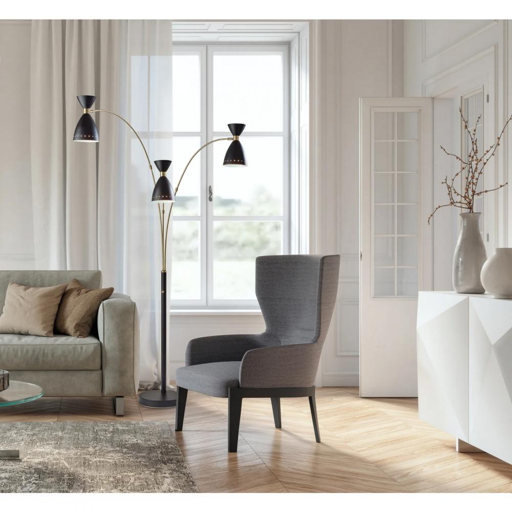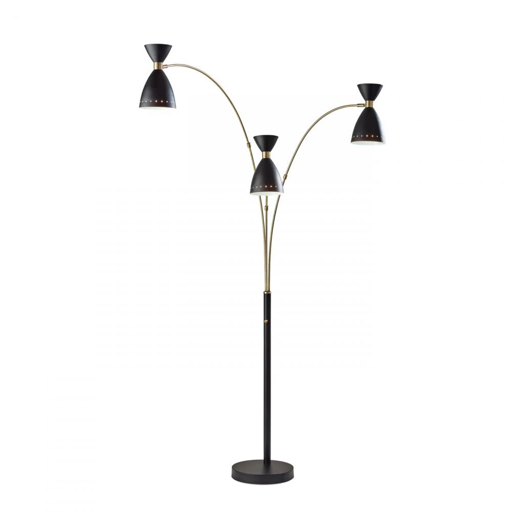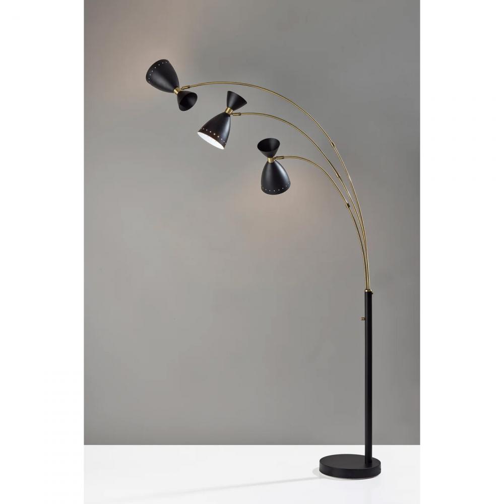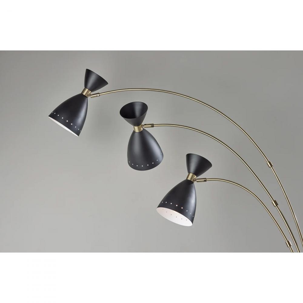 Bring a modern touch to your decor with the clean styling of the Oscar 3-arm arc floor lamp. The arcing design and slender profile of this 82? tall lamp makes it the perfect addition in room corners or beside furniture. The round black painted metal base provides stability, and the black finish continues through the pole leading to three long and slender antique brass arcing arms. Each arm is topped by a 40W bulb (not included) and a contemporary black metal bell-shaped shade with antique brass accents. The three arms can be swiveled and repositioned from the base, and each head features an adjustable joint, allowing you to direct the light wherever it's needed. Operated by a rotary switch located on the pole, this lamp features multiple lighting settings. A simple twist of the switch turns one lightbulb on, another twist turns two of the lightbulbs on, a third twist illuminates all three of the lights, and a fourth twist turns all lights off. The Oscar 3-arm arc lamp is also available in a white metal finish.