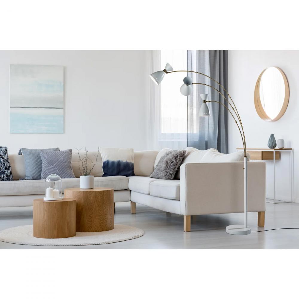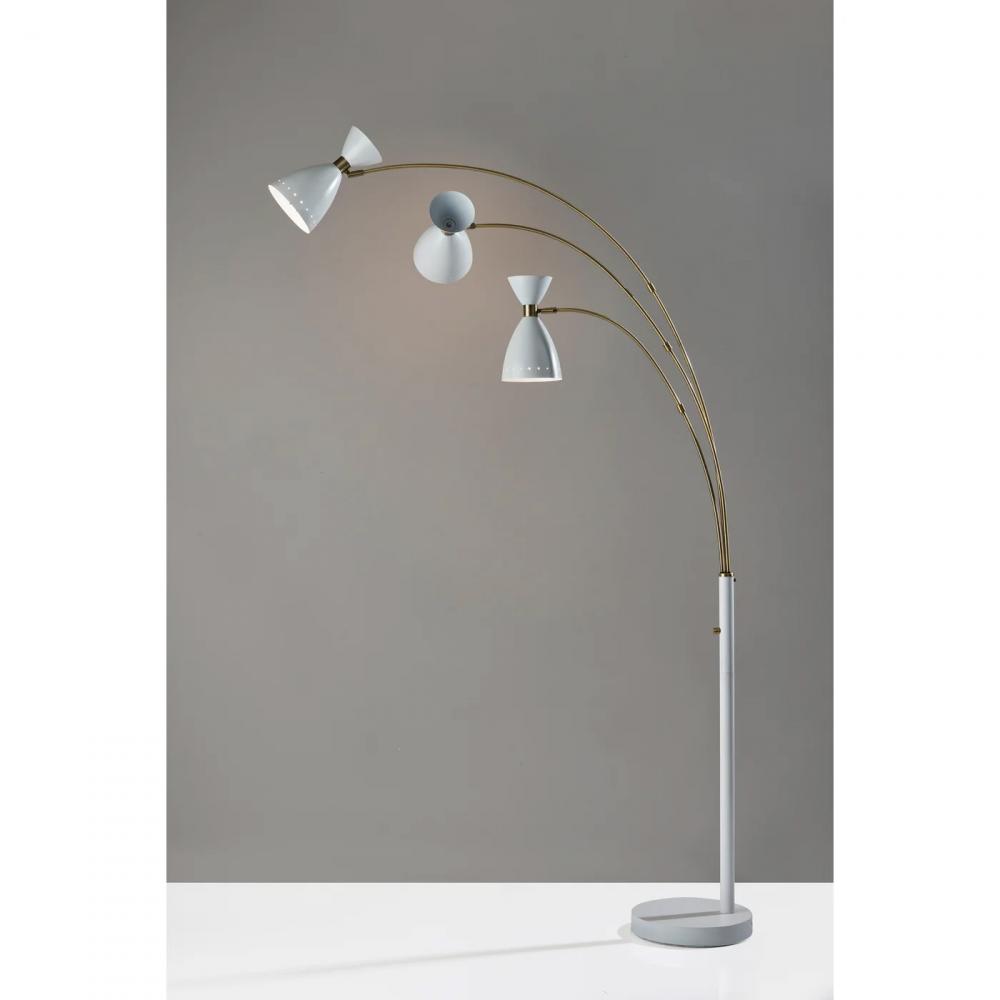 Bring a modern touch to your decor with the clean styling of the Oscar 3-arm arc floor lamp. The arcing design and slender profile of this 82? tall lamp makes it the perfect addition in room corners or beside furniture. The round white painted metal base provides stability, and the white finish continues through the pole leading to three long and slender antique brass arcing arms. Each arm is topped by a 40W bulb (not included) and a contemporary black metal bell-shaped shade with antique brass accents. The three arms can be swiveled and repositioned from the base, and each head features an adjustable joint, allowing you to direct the light wherever it's needed. Operated by a rotary switch located on the pole, this lamp features multiple lighting settings. A simple twist of the switch turns one lightbulb on, another twist turns two of the lightbulbs on, a third twist illuminates all three of the lights, and a fourth twist turns all lights off. The Oscar 3-arm arc lamp is also available in a black metal finish.