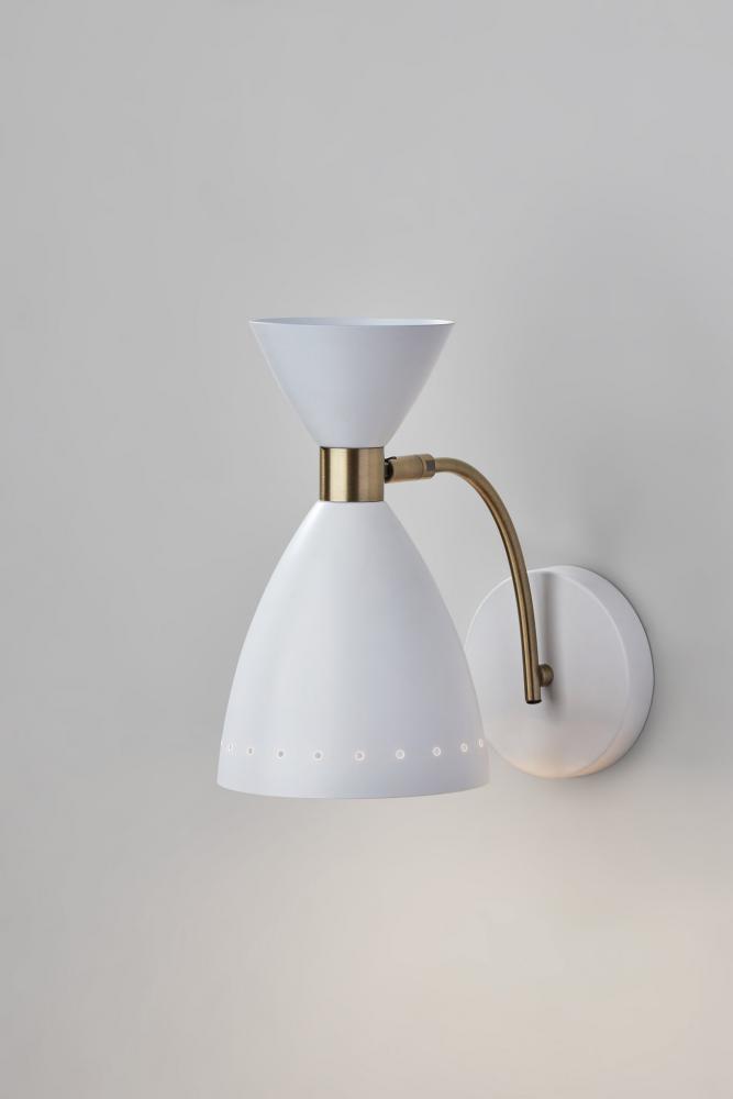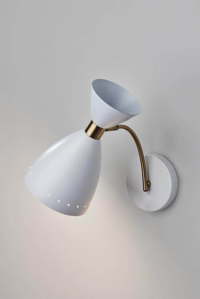 Combining monochromatic white metal construction and antique brass accents, the Oscar wall light brings a mid-century modern look and finish to your space. For symmetrical design, pair two of these sconces on either side of beds, fireplaces, or mirrors or place individually in entryways or other spaces for a pop of light. The lamp features a 5" diameter painted metal base supporting an upwardly arcing antique brass stem. The white metal cone-shaped shade is ringed with holes to add unique lighting patterns to your room. While the brass stem is fixed, the base of the shade features an articulation point, allowing you to rotate the shade up or down and side to side to direct the light wherever it's needed. The wall lamp powers a 40W bulb or is compatible with dimmable LED bulbs for added versatility. For a contrasting color scheme, the Oscar wall lamp is also available with a black metal finish and antique brass accents.
