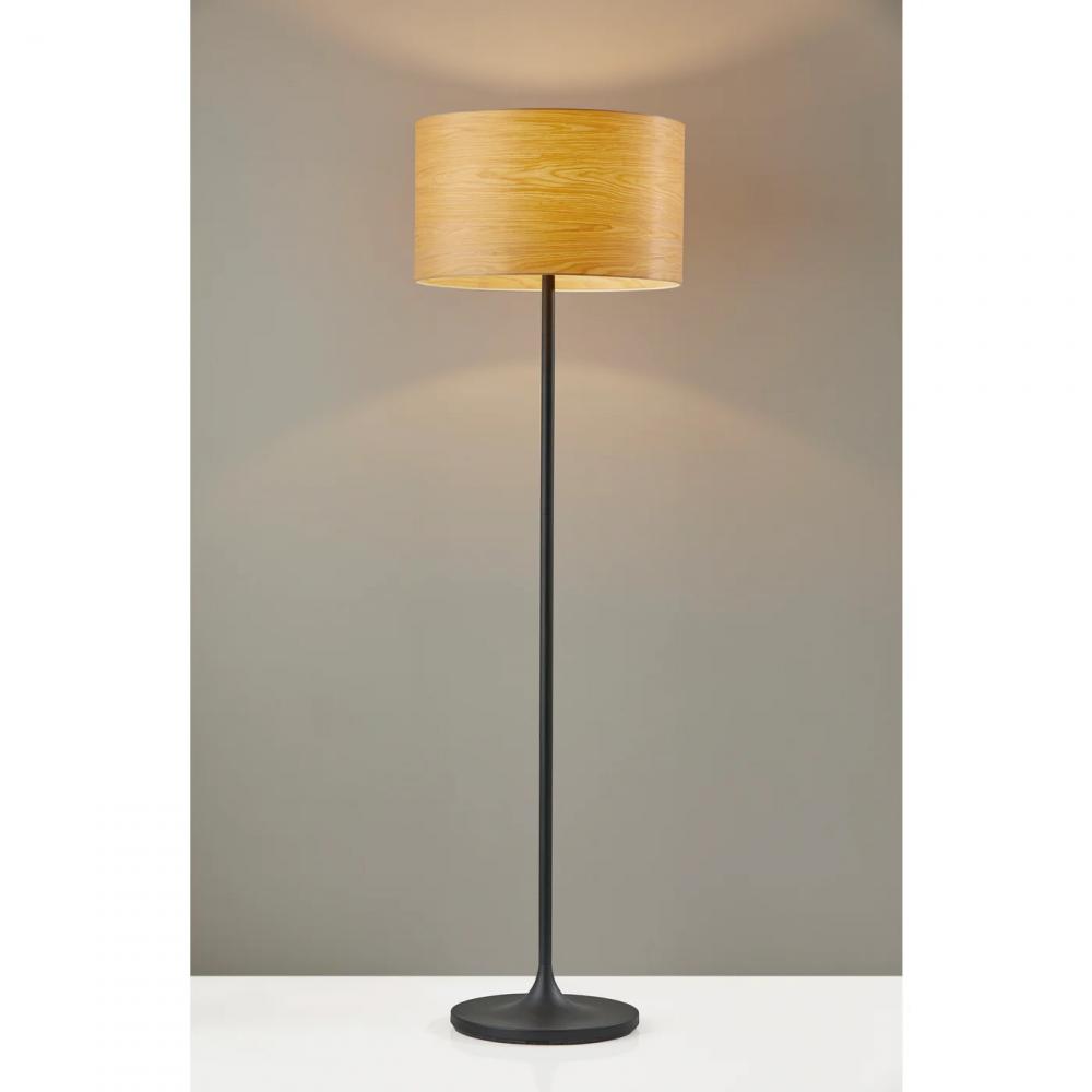 An interpretation of Scandinavian design, the Oslo floor lamp features a matte black modified trumpet shaped base and body and is topped with a hardback drum shade of cherry wood veneer. The wood veneer has a natural wood grain that is highlighted when lit. An on/off rotary switch is located on the socket. This lamp has a clear cord and is smart outlet compatible. Bulb is not inlcuded.