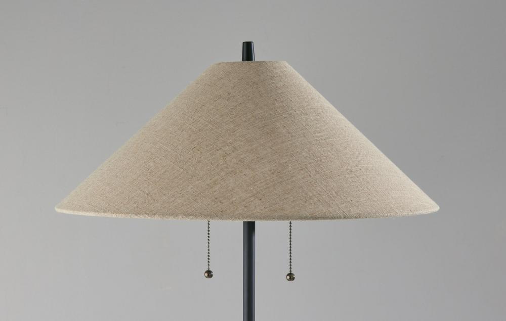 Embrace the mixed materials trend with the contemporary style of the Palmer floor lamp. With its blend of metal and wood materials and complementing black and walnut finishes, this lamp is the perfect style choice for bedrooms, dining rooms, or living spaces. Featuring clean style lines, a round black metal base supports a tall and slim stem in a rich, walnut finish that transitions back to black metal. Topping the lamp is a retro-inspired lampshade that maintains the minimal aesthetic. The taupe textured fabric shade softly diffuses light from two 60W bulbs for a warm glow. Operated by dual pull chain switches, the lamp is also powered by a coordinating 5' black cord. For a striking, contrasting look, the Palmer floor lamp is also available with a blend of black metal and natural wood finishes complemented by a white textured fabric shade. Complete your space's decor with the coordinating Palmer table lamp.