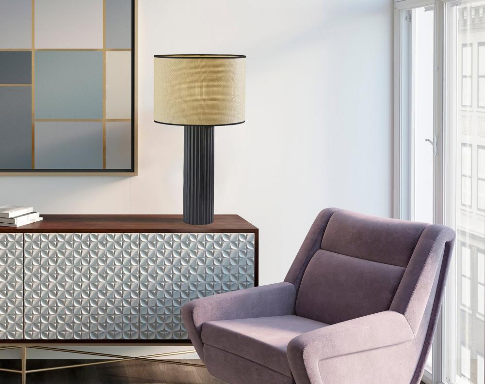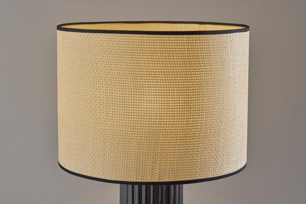 Add easy elegance to your home with the natural materials and subtle embellishments of the 29" tall Primrose table lamp. A natural woven drum shade adds texture and tops a tall, round black ceramic base featuring ribbed detailing. The woven shade softly disperses the light from a 150W bulb and is trimmed in black fabric along the top and bottom to complement the ceramic base. Easily operated by a 3-way rotary socket switch, you can adjust the brightness between low, medium, and high to suit your lighting needs. For a pop of color, this lamp is also available with a cornflower blue base, and both color options are offered in a smaller, 24" tall size for the perfect lighting solution to any space.