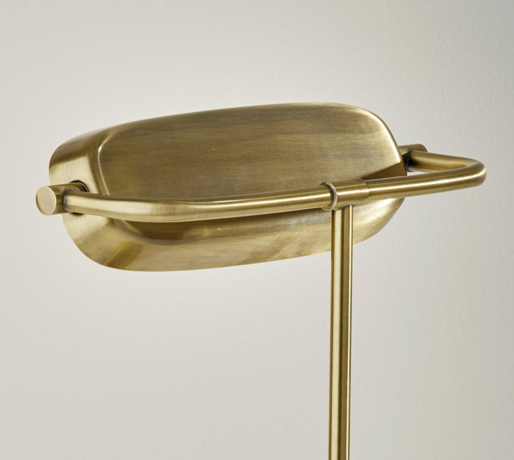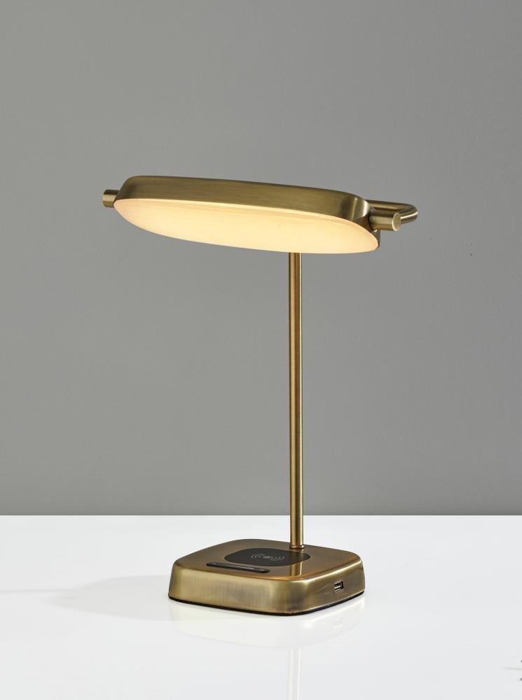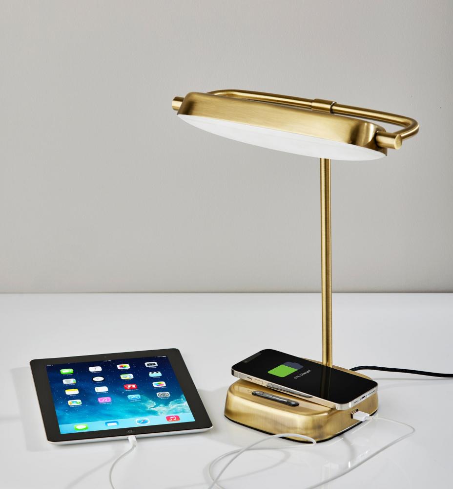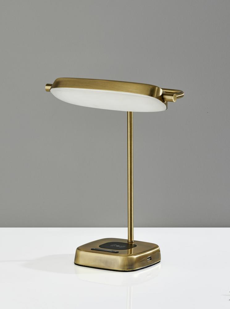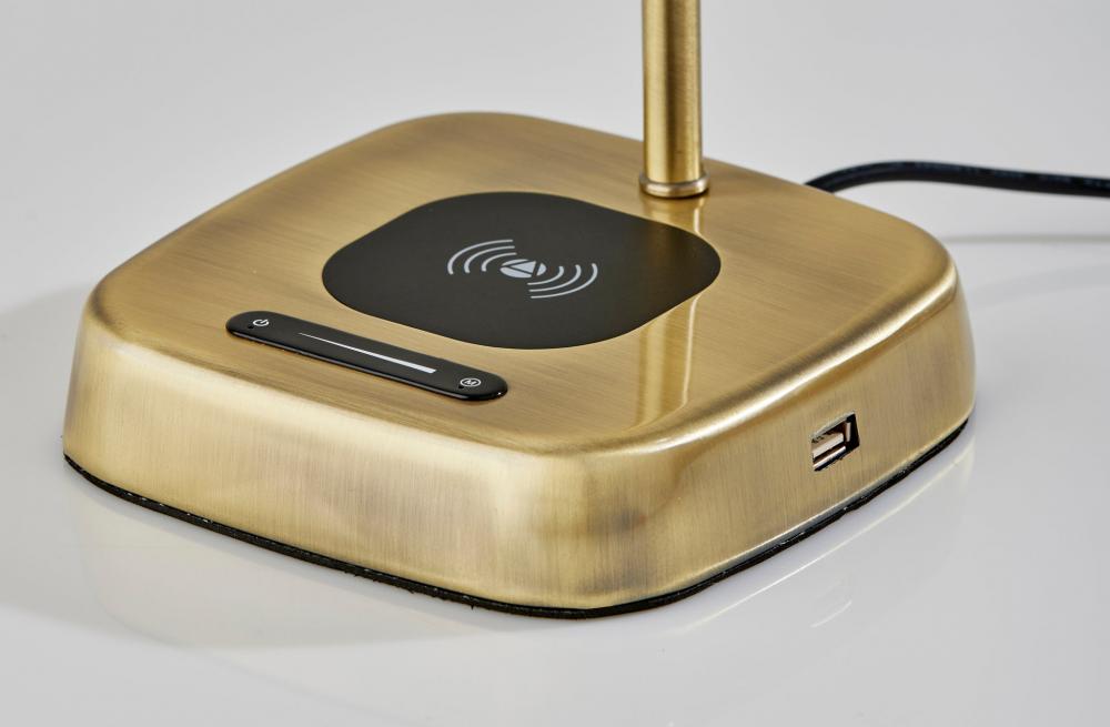 Modern functionality and mid-century modern styling meet in the Radley desk lamp. The lamp is anchored by a 6" square base in an antique brass finish supporting a matching metal stem leading to a rectangular shade. The shade houses an integrated, eco-friendly 8W LED light and a frosted diffuser for even lighting. With a touch smart switch conveniently located on the base, this lamp offers a full-range dimmer and five color temperature settings, making the perfect lighting available at the touch of a finger. For added functionality, the base of the lamp houses an integrated Qi-certified charging pad, supporting 5W charging on contact to get your phone from 0% to 100% in just 3-4 hours. A USB port is also located on the side of the base for charging a second device simultaneously. The lamp is powered by a 5' black cord to coordinate with the antique brass finish. The Radley desk lamp is also available in a brushed steel and black metal finish.