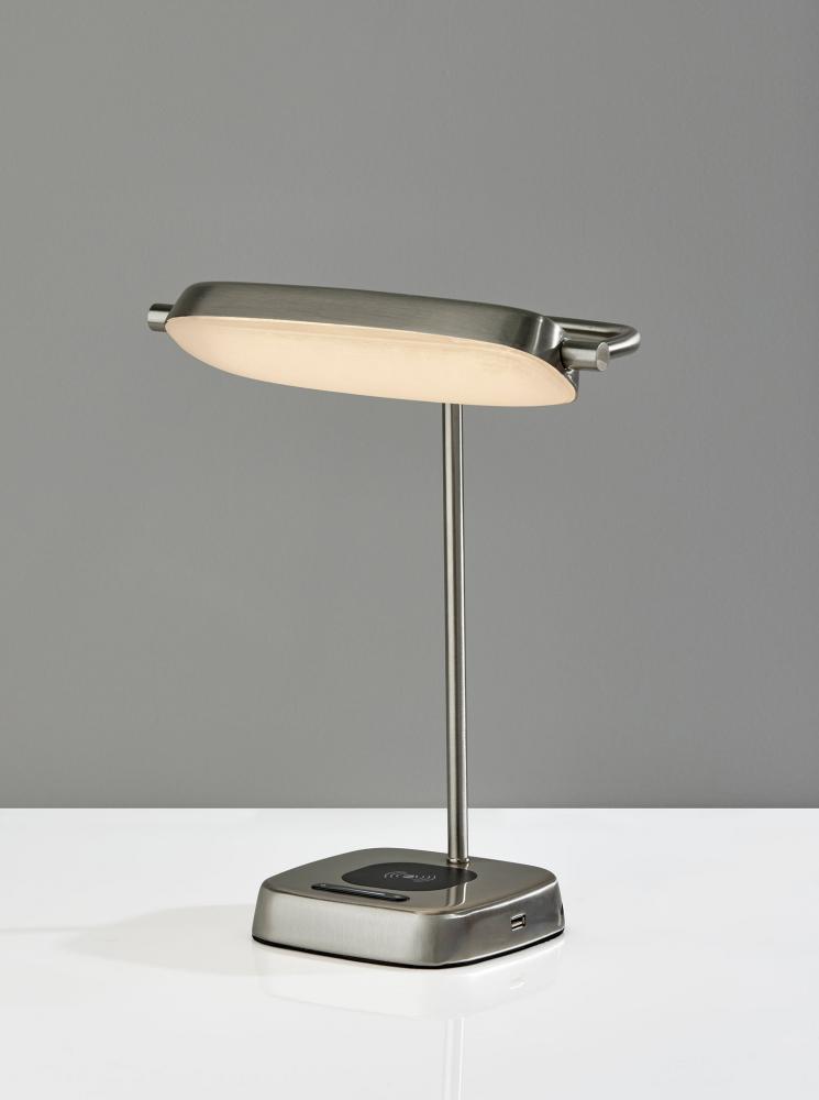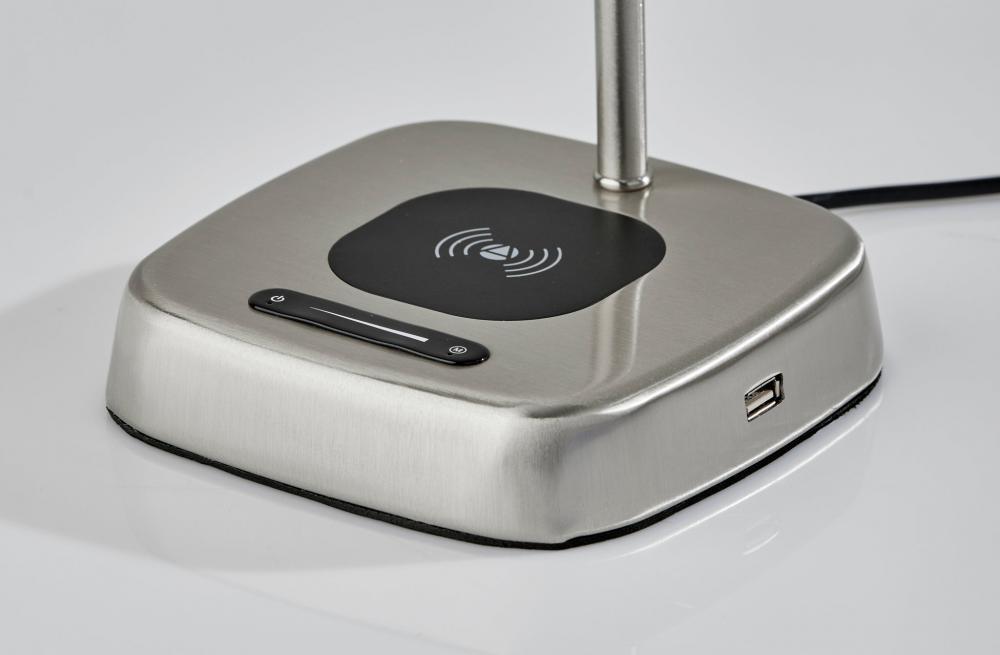 Modern functionality and mid-century modern styling meet in the Radley desk lamp. The lamp is anchored by a 6" square base in a brushed steel finish supporting a matching metal stem leading to a rectangular shade. The shade houses an integrated, eco-friendly 8W LED light and a frosted diffuser for even lighting. With a touch smart switch conveniently located on the base, this lamp offers a full-range dimmer and five color temperature settings, making the perfect lighting available at the touch of a finger. For added functionality, the base of the lamp houses an integrated Qi-certified charging pad, supporting 5W charging on contact to get your phone from 0% to 100% in just 3-4 hours. A USB port is also located on the side of the base for charging a second device simultaneously. The lamp is powered by a 5' black cord to coordinate with the brushed steel finish. The Radley desk lamp is also available in an antique brass and black metal finish.