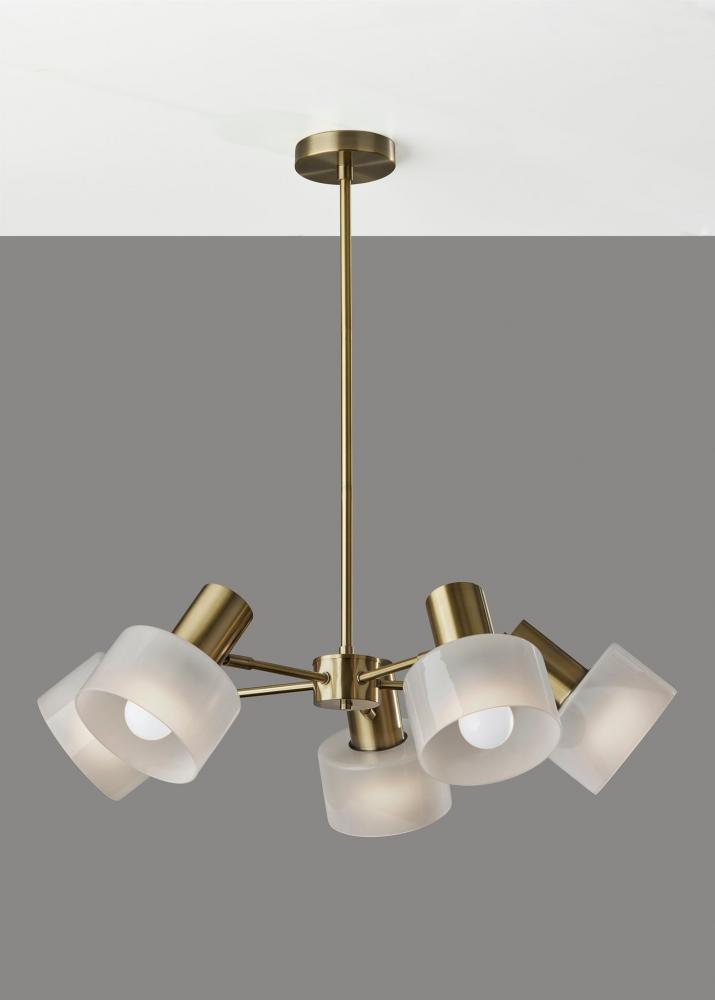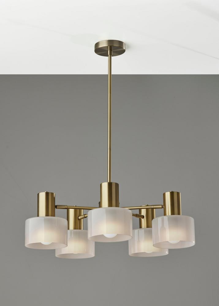 Introducing the 3938-21 Rhodes Chandelier, a masterful blend of elegance and versatility that effortlessly harmonizes timeless design with modern sophistication. This chandelier showcases an Antique Brass finish that bestows vintage charm and sophistication upon your decor. Its five glass shades create a captivating contrast, with glossy white exteriors exuding contemporary flair, while the frosted interiors diffuse a soft and inviting glow. What truly distinguishes the Rhodes Chandelier is its adjustability—each of the five shades can be positioned independently, allowing you to craft a tailored lighting arrangement. Designed to serve as both an illumination source and a focal point, this chandelier also offers customization. Included are two extra 8-inch poles, enabling you to adapt the lamp's height to match your ceiling height perfectly. With its timeless design and understated elegance, the Rhodes Chandelier enhances the ambiance of your space, illuminating it with sophistication and adaptability.