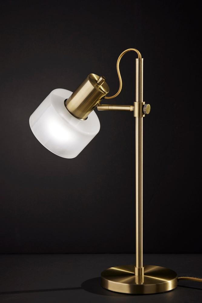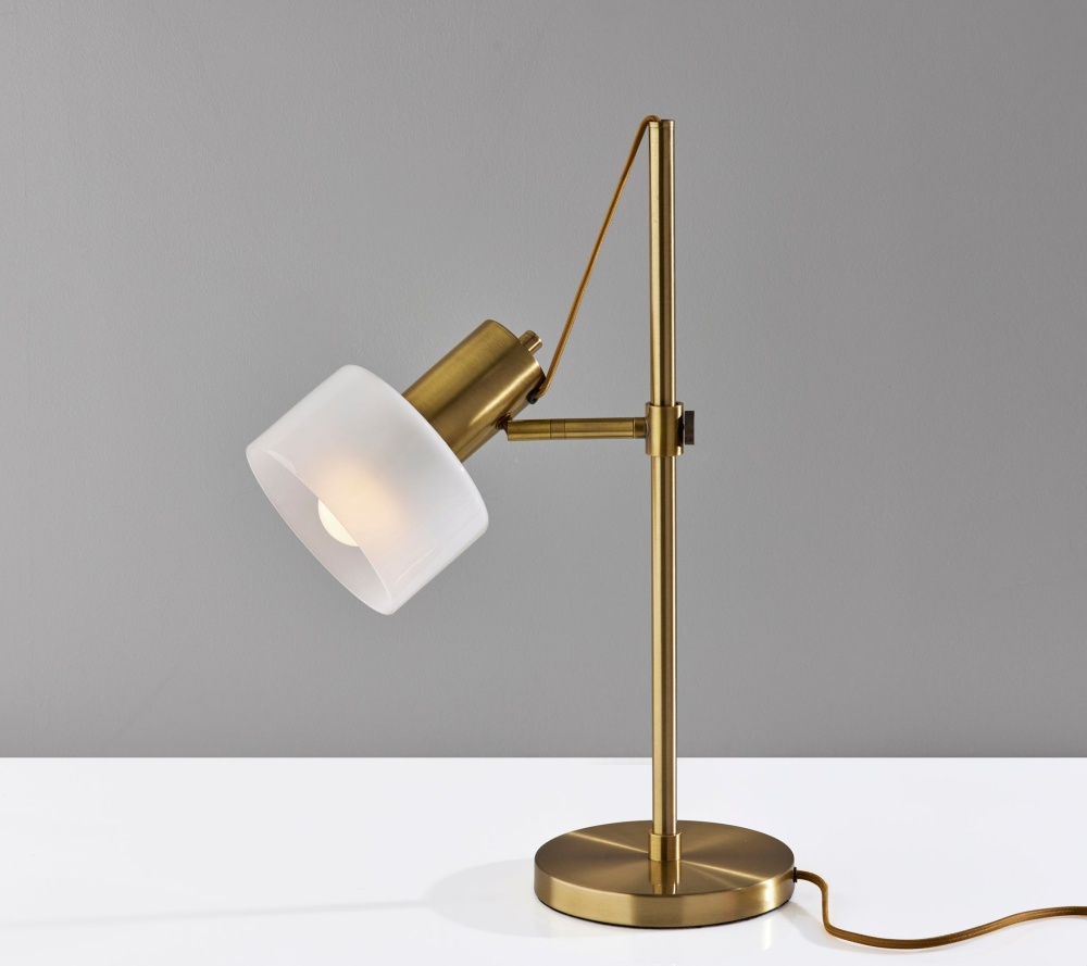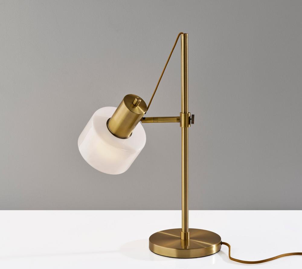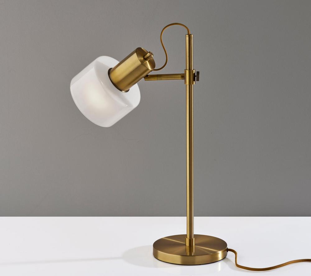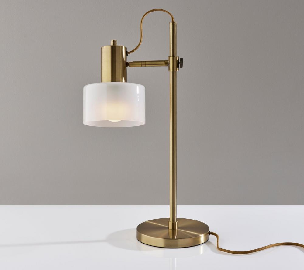 Introducing the 3939-21 Rhodes Desk Lamp, a refined and functional lighting solution that effortlessly combines vintage aesthetics with contemporary design. This desk lamp boasts an Antique Brass finish that adds a touch of timeless elegance to your decor. Its glass shade is a study in contrast, featuring a glossy white exterior for a modern twist, while the frosted interior diffuses a soft and inviting glow. With a height of 23 inches and an adjustable shade, the Rhodes Desk Lamp offers both focused illumination and style, making it a versatile addition to your workspace. Designed for user-friendly operation, this lamp features an on/off rotary switch conveniently located on the shade, allowing you to control the lighting with ease. The beige fabric-covered cord complements the lamp's design, adding a subtle touch of sophistication. The Rhodes Desk Lamp seamlessly combines form and function, making it an ideal choice for enhancing the ambiance of your workspace.