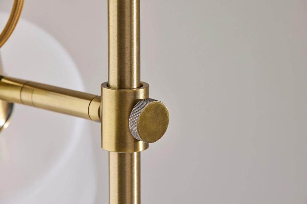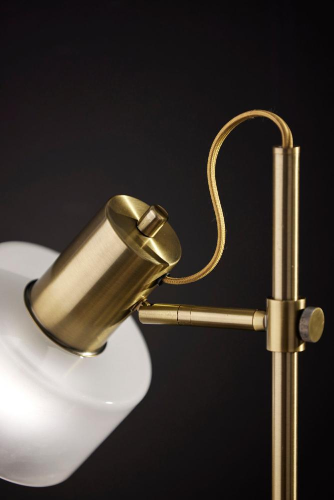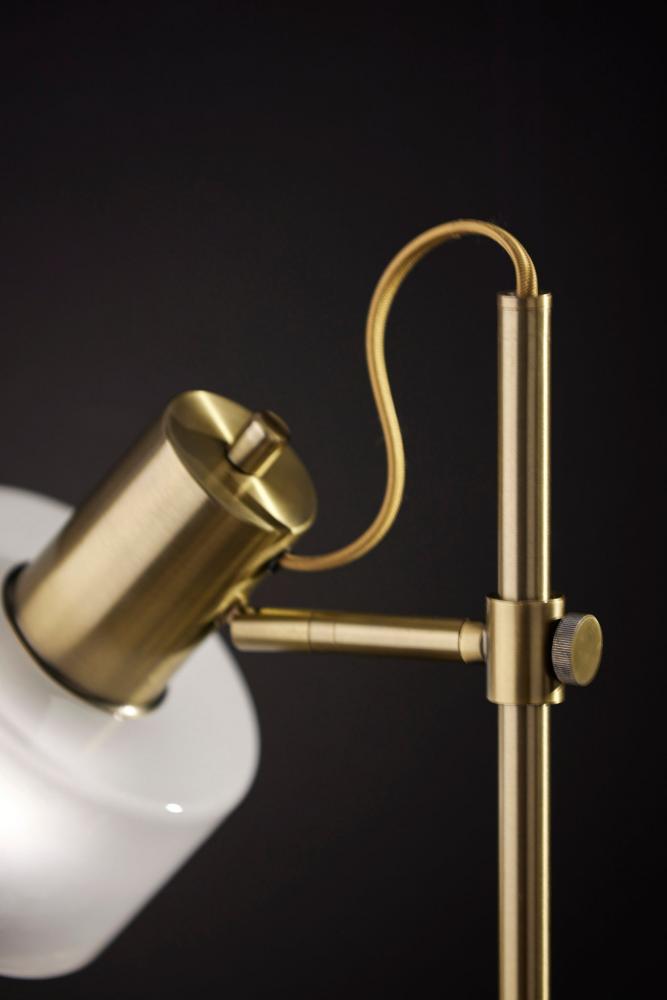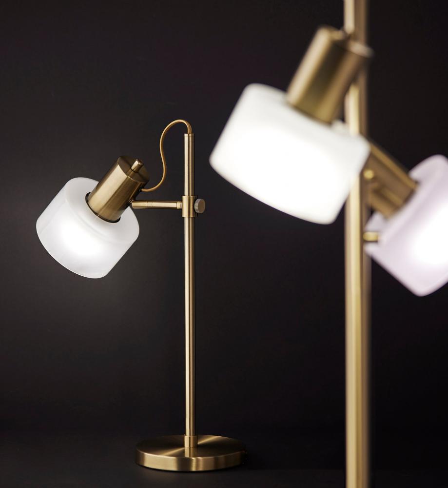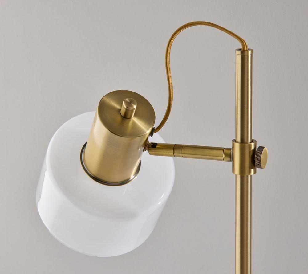 Introducing the 3939-21 Rhodes Desk Lamp, a refined and functional lighting solution that effortlessly combines vintage aesthetics with contemporary design. This desk lamp boasts an Antique Brass finish that adds a touch of timeless elegance to your decor. Its glass shade is a study in contrast, featuring a glossy white exterior for a modern twist, while the frosted interior diffuses a soft and inviting glow. With a height of 23 inches and an adjustable shade, the Rhodes Desk Lamp offers both focused illumination and style, making it a versatile addition to your workspace. Designed for user-friendly operation, this lamp features an on/off rotary switch conveniently located on the shade, allowing you to control the lighting with ease. The beige fabric-covered cord complements the lamp's design, adding a subtle touch of sophistication. The Rhodes Desk Lamp seamlessly combines form and function, making it an ideal choice for enhancing the ambiance of your workspace.
