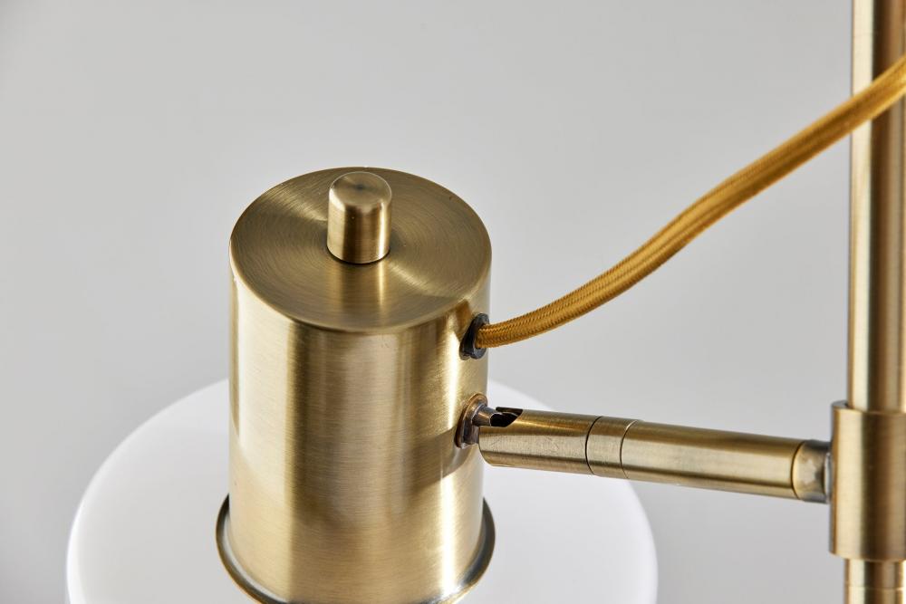 Introducing the 3940-21 Rhodes Floor Lamp, a harmonious blend of classic elegance and contemporary functionality. This floor lamp boasts an Antique Brass finish that bestows vintage charm and sophistication upon your decor. Its glass shade is a study in contrast, featuring a glossy white exterior for a modern twist, while the frosted interior diffuses a soft and inviting glow. With a height of 56 inches and an adjustable shade, the Rhodes Floor Lamp offers both focused illumination and versatile style, making it an ideal addition to your living space. Designed for user-friendly operation, this lamp features an on/off rotary switch thoughtfully positioned on the shade, allowing you to control the lighting with ease. The beige fabric-covered cord complements the lamp's design, adding a subtle touch of sophistication. The Rhodes Floor Lamp seamlessly marries form and function, making it a perfect choice for enhancing the ambiance of your room.