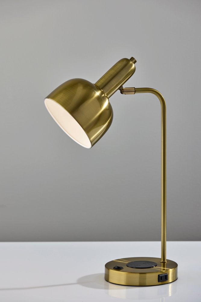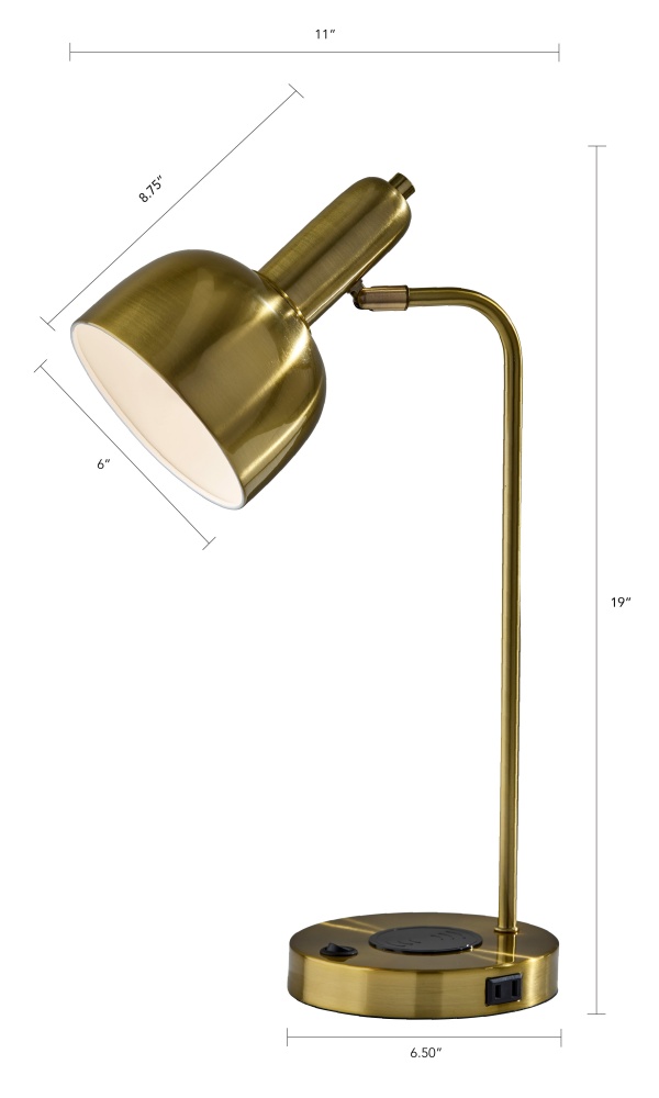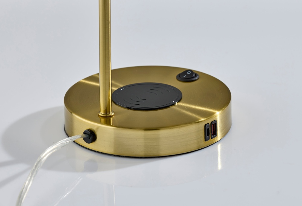 The Rico Supercharger Desk Lamp is where sleek design meets smart functionality. Available in antique brass or brushed steel finishes, this 19" desk lamp features an adjustable shade and a clean, modern profile that enhances any workspace. Designed for today’s tech-driven lifestyle, the base includes a 2 amp USB-A port, a 2 amp USB-C port, an AC outlet, and a built-in 10W Qi wireless charging pad—making it a powerful hub for your daily essentials. The on/off rocker switch on the base ensures easy operation, blending convenience with contemporary style.