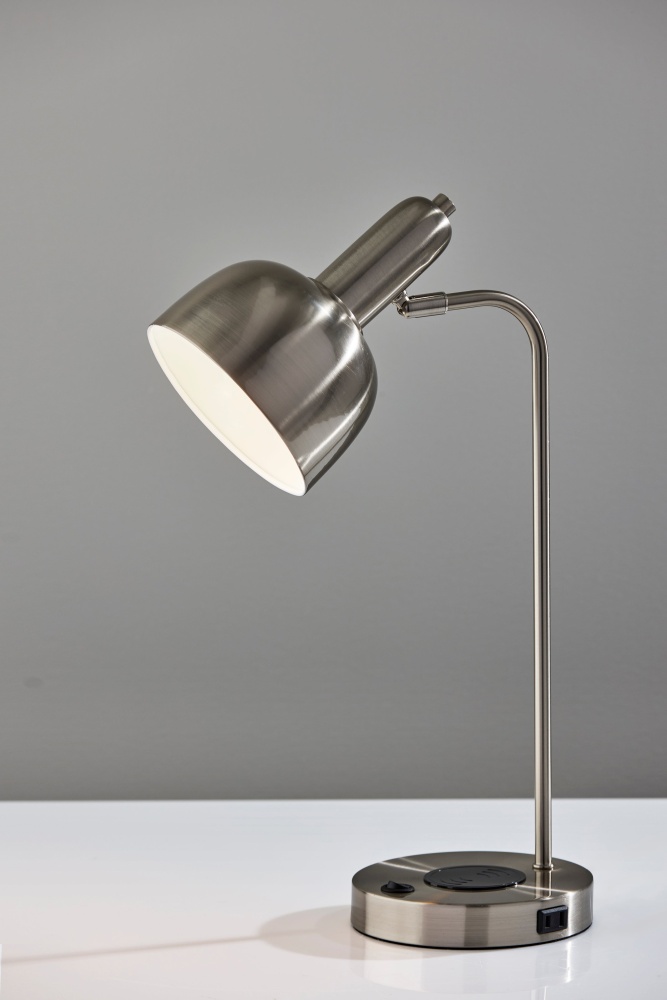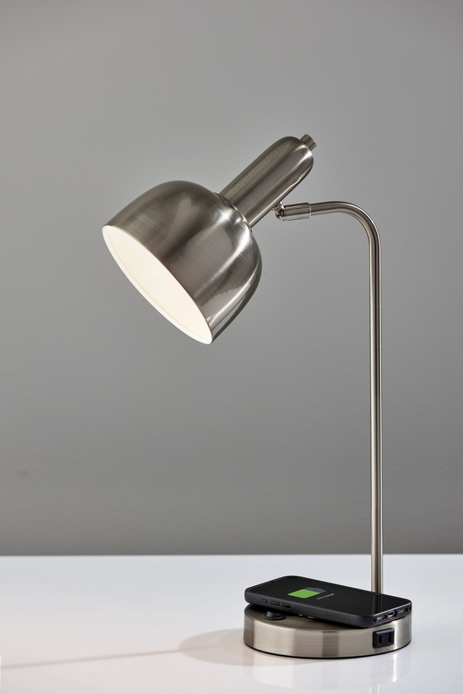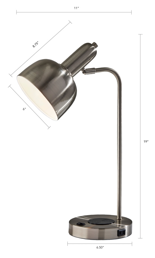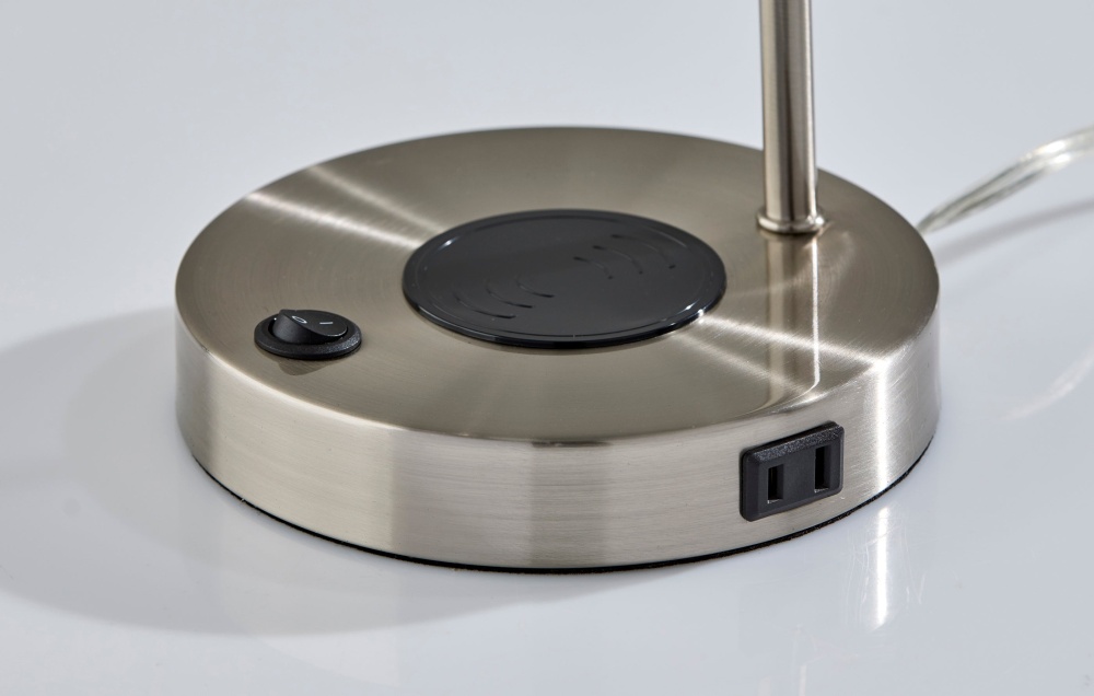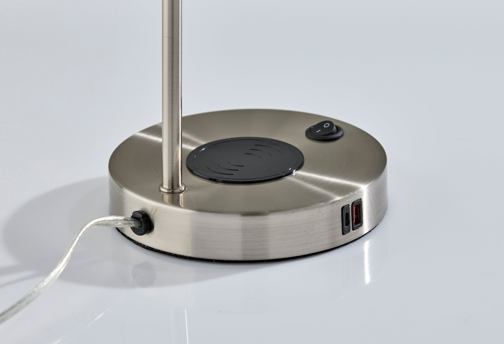 The Rico Supercharger Desk Lamp is where sleek design meets smart functionality. Available in antique brass or brushed steel finishes, this 19" desk lamp features an adjustable shade and a clean, modern profile that enhances any workspace. Designed for today’s tech-driven lifestyle, the base includes a 2 amp USB-A port, a 2 amp USB-C port, an AC outlet, and a built-in 10W Qi wireless charging pad—making it a powerful hub for your daily essentials. The on/off rocker switch on the base ensures easy operation, blending convenience with contemporary style.