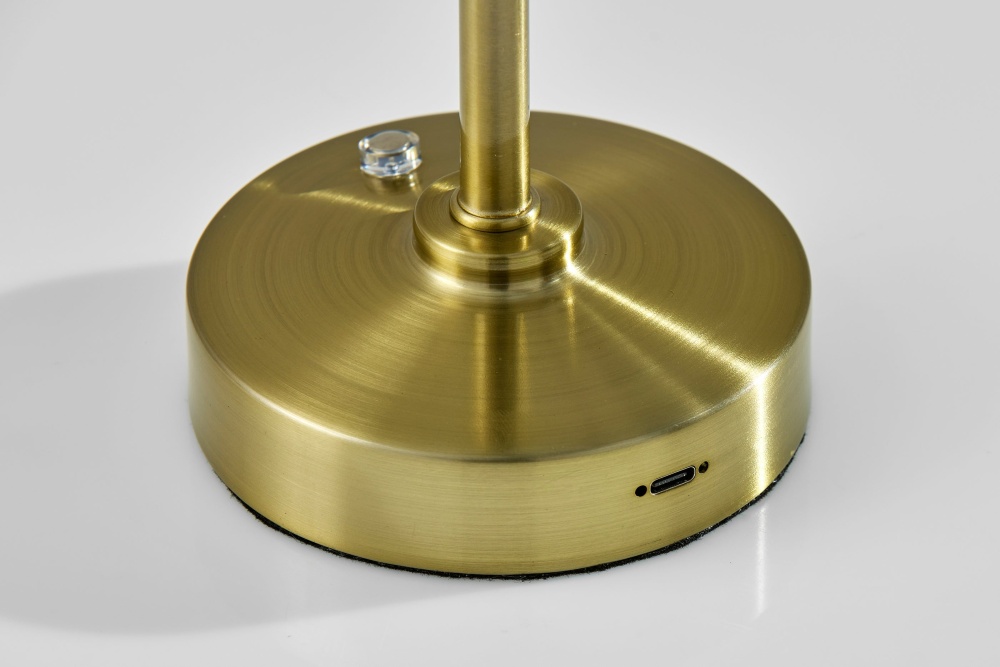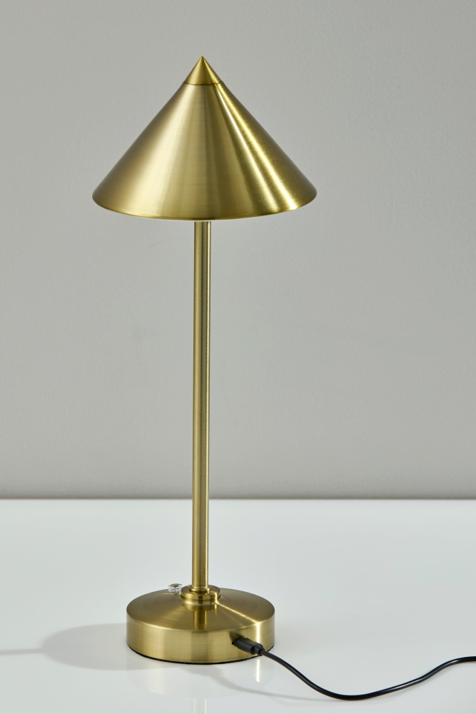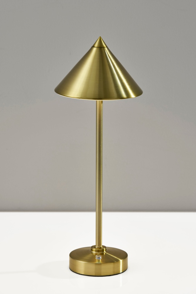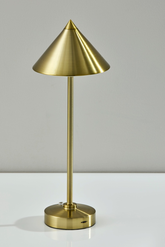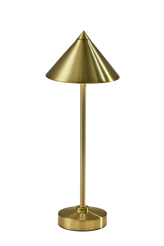 Introducing the 2601-21 Ritchie Cordless LED Table Lamp, a versatile lighting solution designed for both indoor and outdoor use. With its antique brass finish and elegant tapered cone-shaped shade, this lamp brings a touch of sophistication to any space. Standing at a height of 15 inches, it's perfect for tabletops, desks, or outdoor entertaining areas. Equipped with a convenient 3 Level Touch Dimmer Switch, you can easily adjust the brightness to create the perfect ambiance. Powered by a rechargeable 2W LED, it provides long-lasting illumination without the need for cords. Plus, with its IPX4 location rating, you can confidently use it outdoors, even in damp conditions.