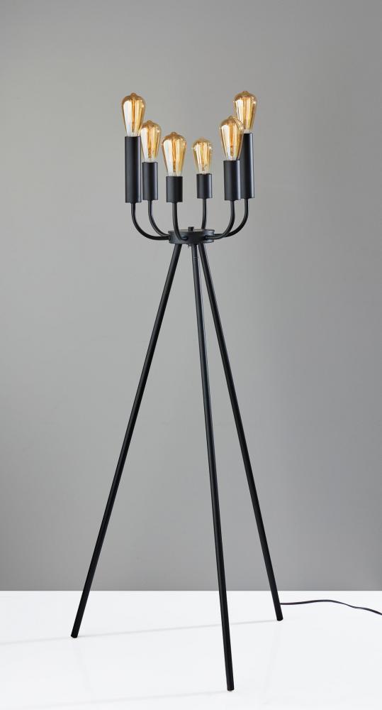 A modern reimagining of the classic candelabra, the 55" tall Rory floor lamp transforms dining rooms, bedrooms, and living areas. Crafted of black metal, the style-driven design of the lamp complements mid-century modern, vintage, and industrial decor. Three slender poles form a sturdy triangle base topped by six slender, upwardly-curving arms of varying lengths. Each arm culminates in an exposed 40W bulb. Vintage Edison bulbs (not included) are a striking addition to the lamp's sculptural silhouette. The lamp is easily turned on and off with a discreet toggle switch and is powered by a 6' black cord. Complete your decor with the coordinating Rory table lamp and pendant light.