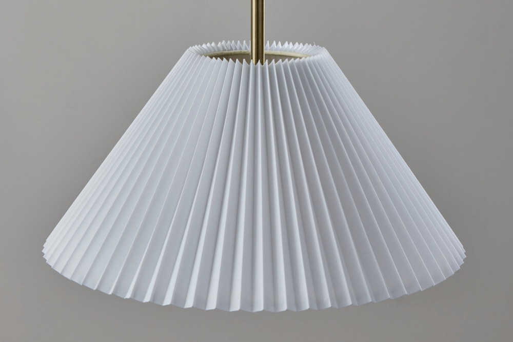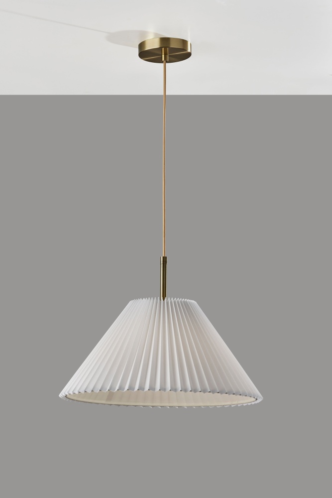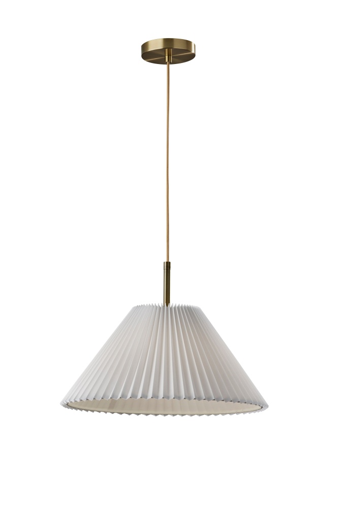 Meet the 3803-21 Scarlet Pendant, a graceful lighting solution that adds warmth and sophistication to any space. Featuring an antique brass finish and a pleated off-white tapered fabric shade, this pendant exudes timeless elegance. Its beige fabric-covered cord enhances its vintage charm, while its hardwire compatibility ensures seamless installation. Elevate your home's ambiance with the Scarlet Pendant's understated beauty and refined style.