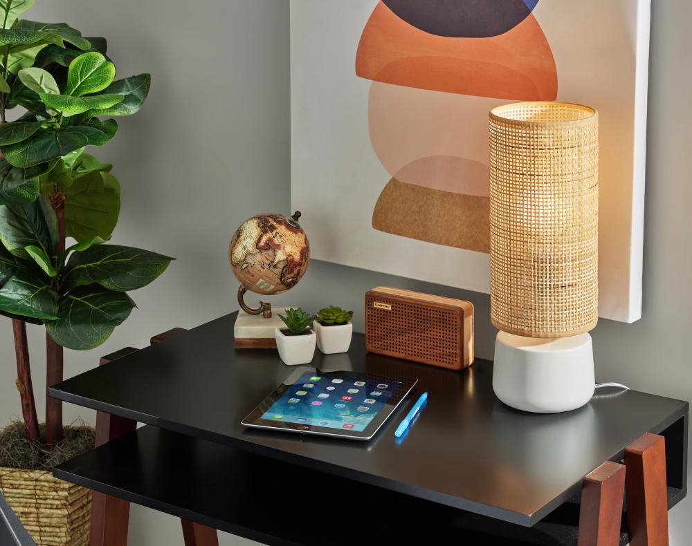With soft curves and a warm, coastal design, the Sheffield table lantern is the perfect addition to nightstands, desks, or accent tables. The 16" tall lantern features a short, round base crafted of white ceramic leading to a tall natural rattan drum shade. The woven rattan shade softly disperses light from a 40W bulb and is trimmed in beige fabric along the top and bottom, complementing the white base. Easily operated by a rocker switch, the lantern is powered by a 5' clear cord. For a contrasting color scheme, the Sheffield table lantern is also available with a black ceramic base, while the turquoise ceramic base option adds a vibrant pop of color. Complete your decor with the coordinating Sheffield table lamp, featuring a tall ceramic base and short rattan drum shade.