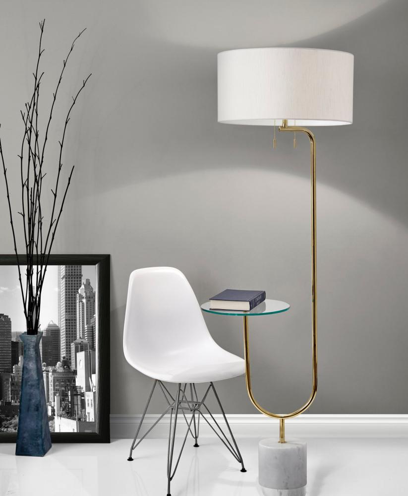 Add a sleek, modern look to your bedside or living room with the Sloan Shelf Floor Lamp. A swooping polished nickel pole holds up ta large drum shade and a round, glass tabletop. With a double socket and 2 pull chain switches, you can adjust the light to suit your needs. A beautiful textured white fabric shade is paired with a chunky white marble base finish off the elegant look. This floor lamp is the perfect combination of a side table and floor lamp.