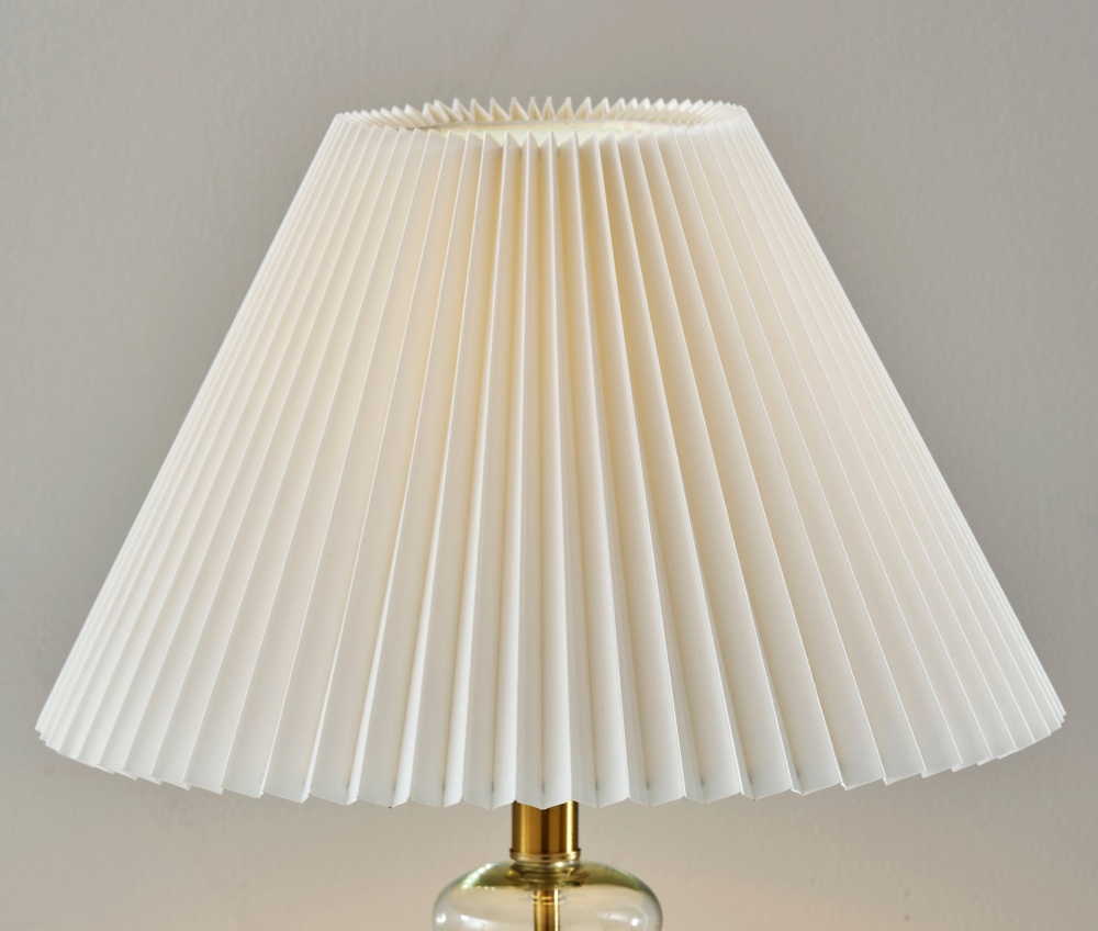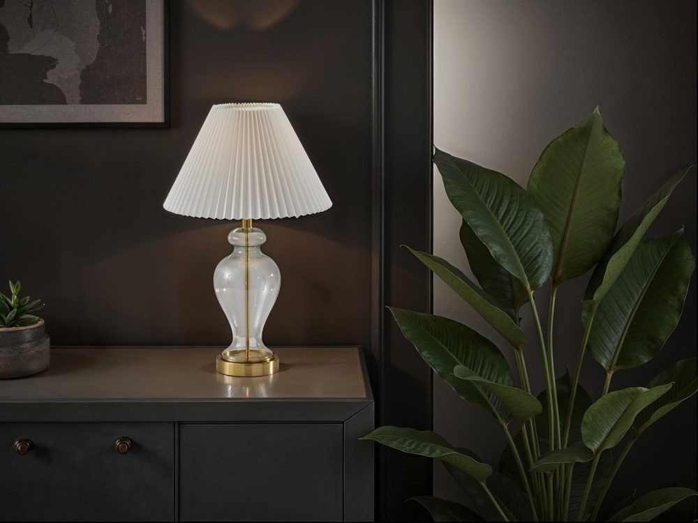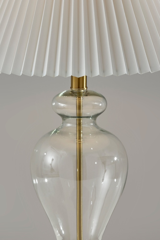 Meet the SL3985-02 Sonata Table Lamp, a stunning combination of vintage charm and contemporary design. Its clear glass base, adorned with antique brass accents, adds an air of sophistication to any room. Paired with an off-white pleated fabric shade, this lamp exudes elegance and warmth, casting a soft and inviting glow. Standing at 26 inches tall, it serves as a versatile lighting solution for side tables, nightstands, or desks. The on/off rotary switch on the socket ensures easy operation, making it a stylish and functional addition to your home decor.