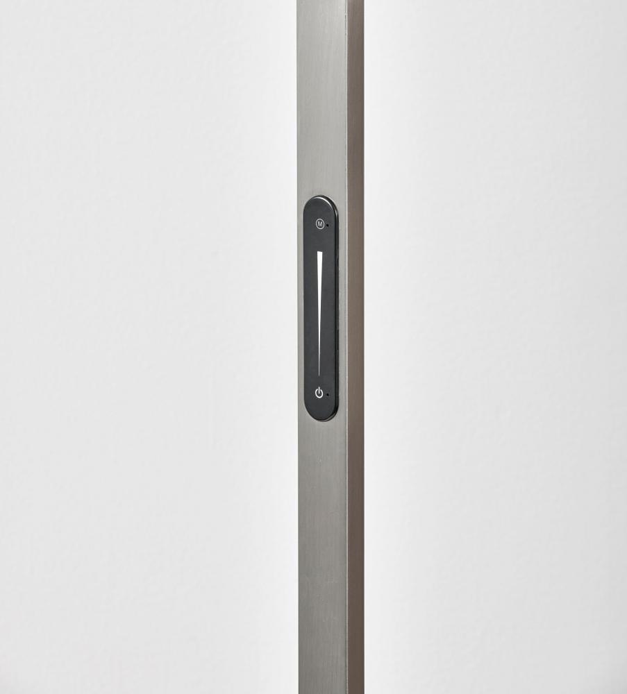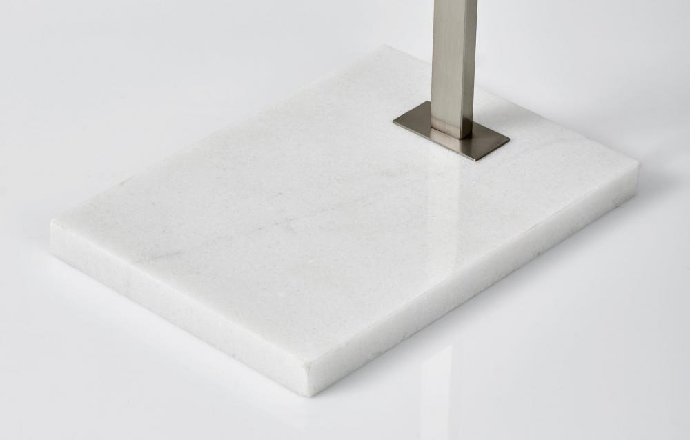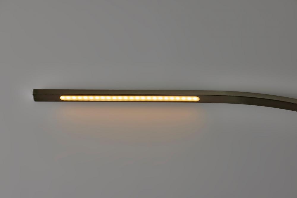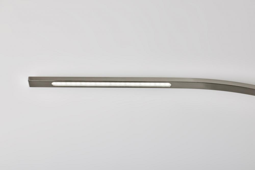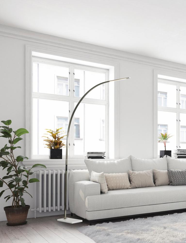 The Sonic floor lamp's dramatic arc of brushed steel illuminates any room with 2,000 lumens of energy-efficient 24W LED lighting. Rated to last 50,000 hours, the LED lighting is integrated into the lamp and softened by a frosted diffuser. The slender rectangular tube extends more than 7' and offers a smart switch with a full-range dimmer and five settings to find the perfect color temperature for your mood, from crisp to warm, at the touch of a finger. Anchoring the lamp is a rectangular white marble base that adds a hint of elegance. This lamp is powered by a 5' black cord. The Sonic LED arc lamp is also available with an antique brass or black metal finish.