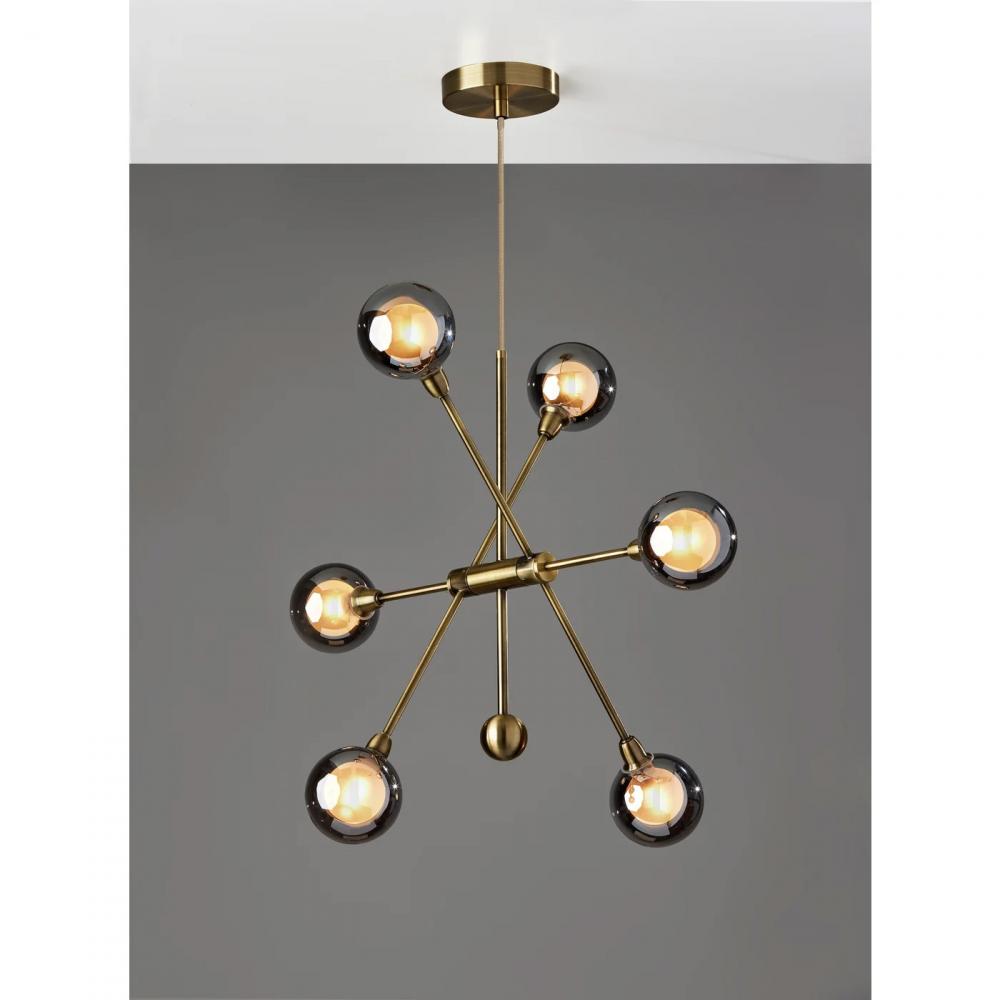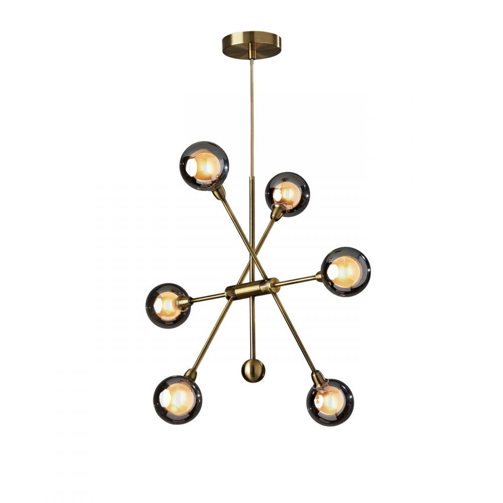 Add a fun and unique addition to entryways, kitchens, dining areas, and more with the Starling LED 6 light chandelier. The antique brass finish on this 24" tall chandelier contrasts beautifully with the 4" diameter Sputnik-style shades. Made of double-layer glass, the 6 shades are frosted on the inside but smoked on the outside for a unique look, while the included 3W LED bulbs are dimmable so you can easily adjust the lighting level. For added versatility, the angle of the light stems is adjustable, allowing you to create a look all your own. The antique brass stem leads to a matching 5" diameter base, and the chandelier features a 72" gold fabric cord, allowing you to adjust the light's height to suit the needs of any room regardless of the ceiling height.