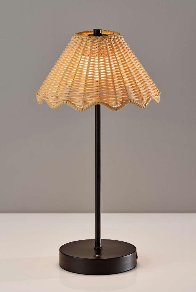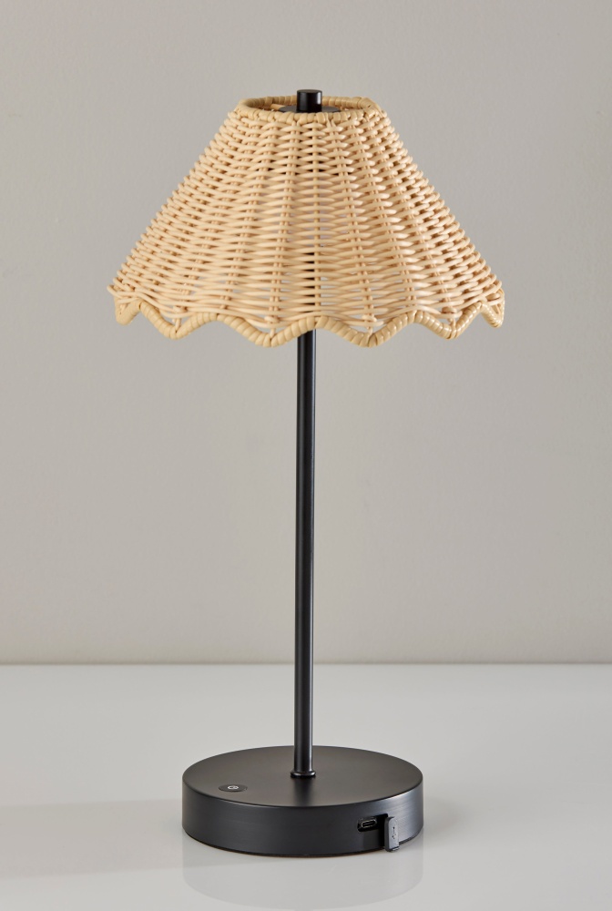 Introducing the 4082-01 Stevie Cordless LED Table Lamp, a stylish and versatile lighting solution for both indoor and outdoor spaces. With its sleek black finish and uniquely designed tapered shade featuring scalloped edges made of durable plastic rattan, this lamp adds a touch of modern elegance to any setting. Standing at 15 inches tall, it offers the perfect balance of form and function. Whether you're enjoying a cozy evening indoors or hosting a gathering in your garden, the Stevie lamp provides adjustable illumination with its 3 Level Touch Dimmer Switch. Powered by a rechargeable 1.5W LED, it offers portability and convenience without the hassle of cords. Plus, with an IPX4 location rating for outdoor use, you can rely on its durability and performance even in outdoor environments.