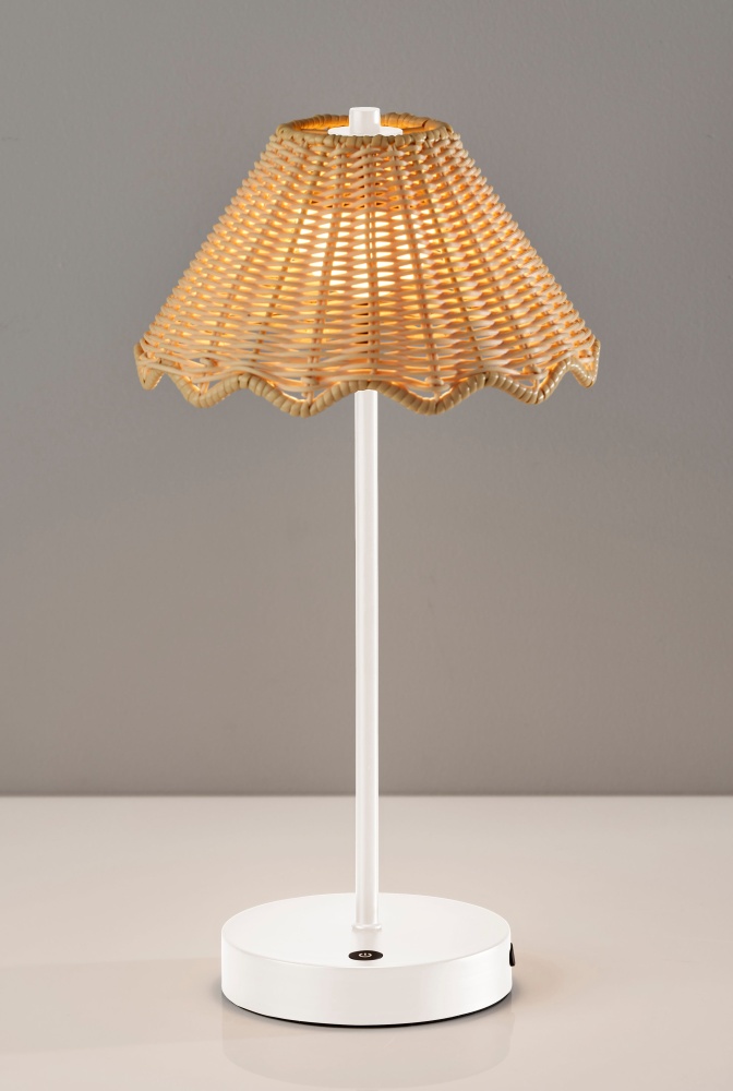 Introducing the 4082-02 Stevie Cordless LED Table Lamp, a versatile lighting solution that combines style and functionality. With its clean white finish and distinctive tapered shade featuring scalloped edges made of durable plastic rattan, this lamp brings a touch of contemporary elegance to any space. Standing at 15 inches tall, it offers adjustable illumination with its 3 Level Touch Dimmer Switch, allowing you to create the perfect ambiance for any occasion. Powered by a rechargeable 1.5W LED, it provides the convenience of portability without the need for cords. Plus, with an IPX4 location rating for outdoor use, you can enjoy its versatility both indoors and outdoors with confidence.