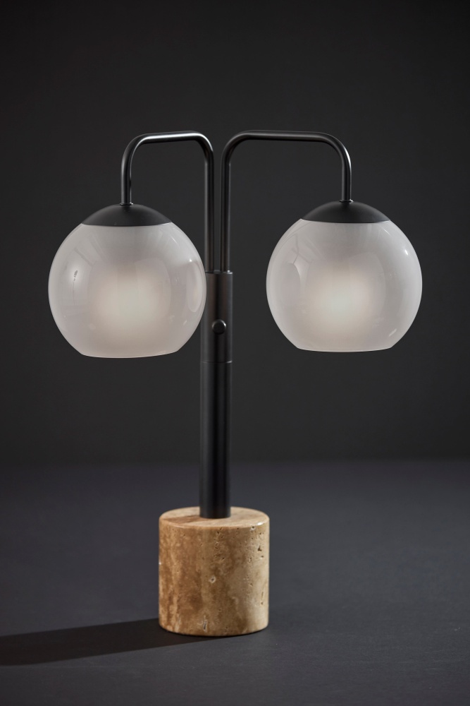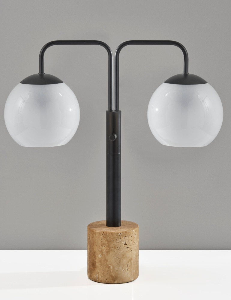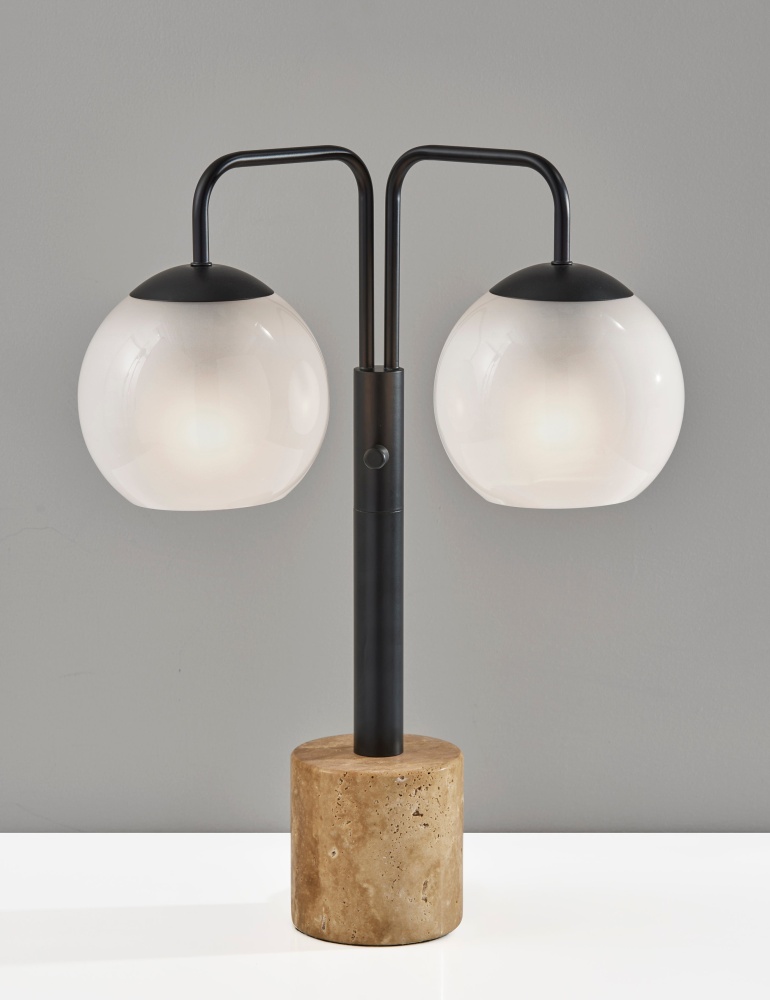 Introducing the 3124-01 Stockton Table Lamp, a sleek and sophisticated addition to your home decor. With its black finish and unique design, this lamp effortlessly combines style with functionality. Featuring two globe-shaped shades, glossy on the outside and frosted on the inside, it creates a soft, ambient glow that adds warmth to any space. Standing at 23.5 inches tall, it is supported by a sturdy travertine stone base, providing stability and visual contrast. The lamp is equipped with a 3-setting Rotary Switch on the pole, allowing you to adjust the brightness to suit your preference.