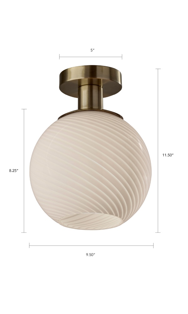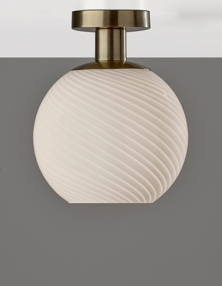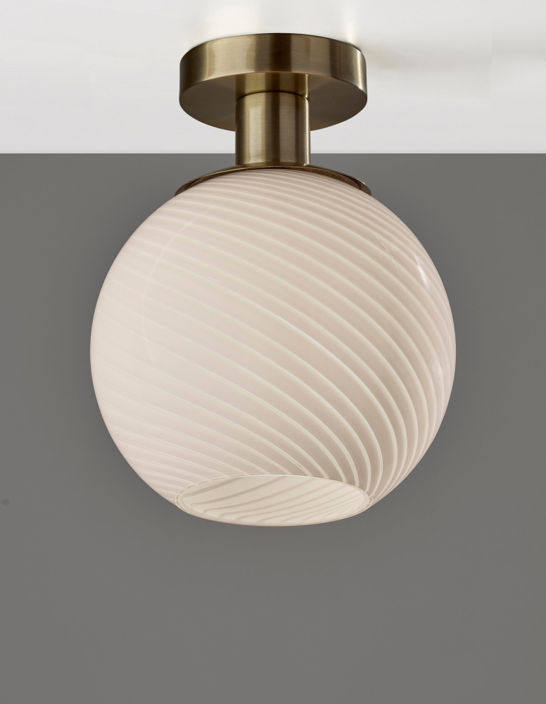 Elevate your ceiling lighting with the Swirl Flush Mount, a compact yet sophisticated fixture that blends vintage charm with modern elegance. Featuring a 9.5" diameter globe-shaped shade crafted from swirled opal glass, this flush mount delivers a soft, diffused glow with subtle visual depth. The antique brass finish adds warmth and timeless appeal, making it a perfect choice for hallways, entryways, bedrooms, or bathrooms. Hardwire compatible and damp location rated, the Swirl Flush Mount is perfect for bathrooms, entryways, or covered outdoor spaces as well.