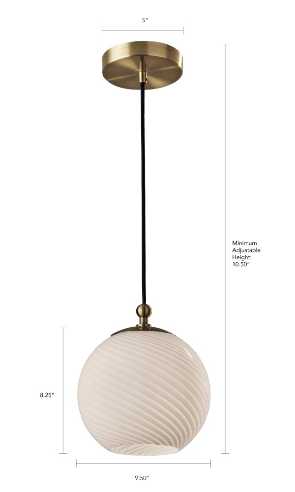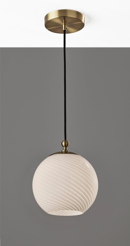 Add a refined touch of modern elegance to your space with the Swirl Pendant. Featuring a globe-shaped shade crafted from swirled opal glass, this pendant casts a soft, ambient glow while offering visual texture and sophistication. The warm antique brass finish pairs beautifully with the 5-foot black fabric-covered cord, creating a striking contrast that suits a variety of interior styles. Hardwire compatible, the Swirl Pendant is perfect for kitchens, hallways, or over bedside tables.