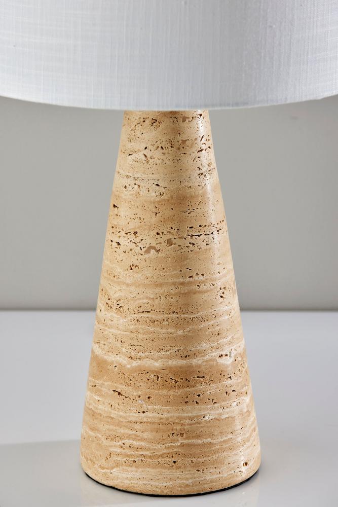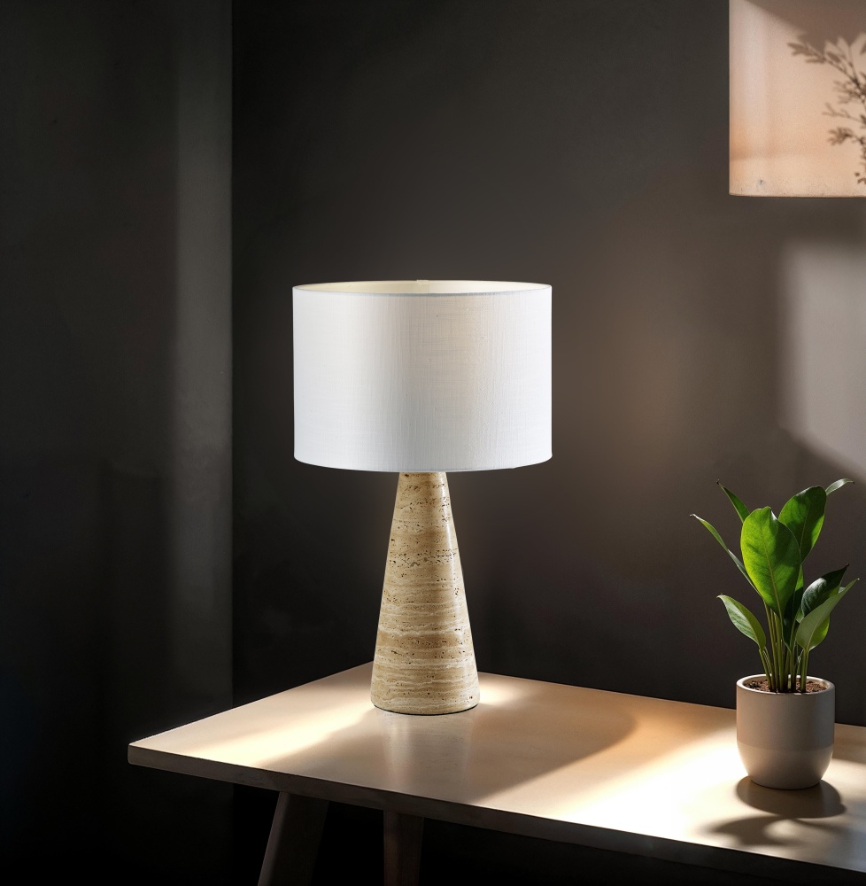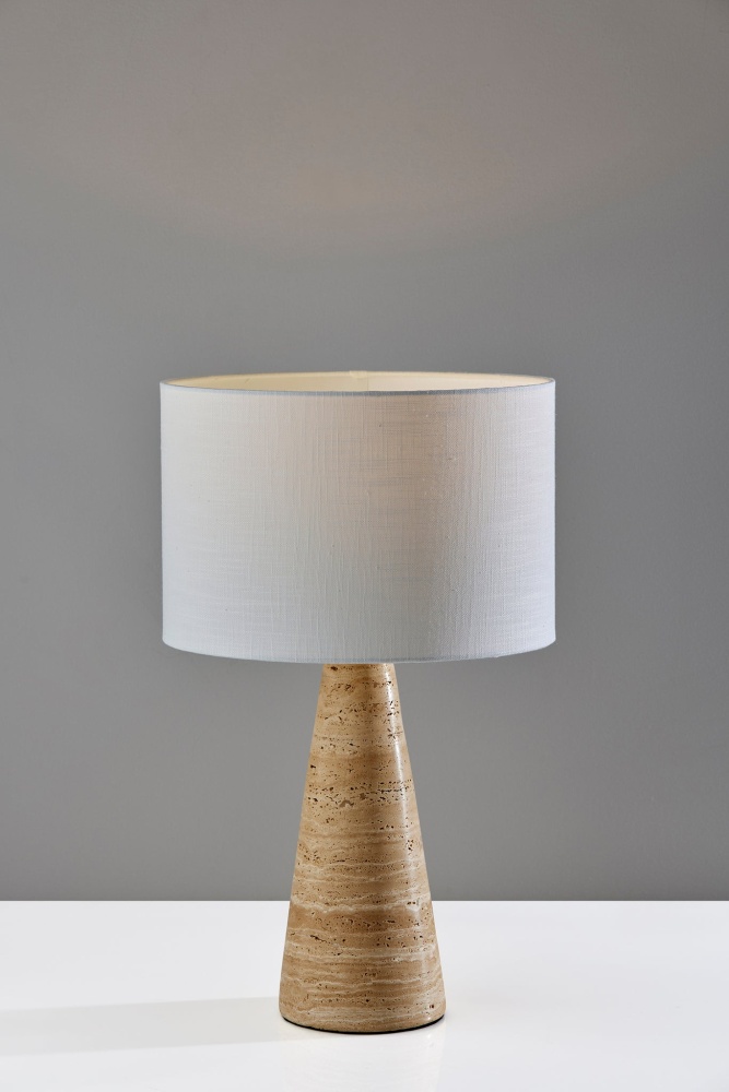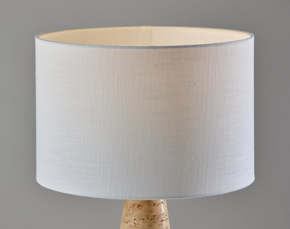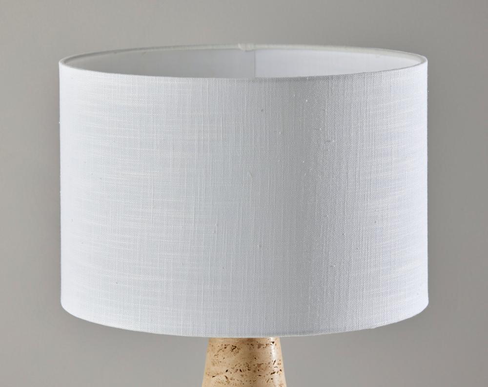 Introducing the 3963-12 Travis Table Lamp, a harmonious blend of natural beauty and contemporary design. This table lamp features a tapered cylinder base crafted from luxurious travertine stone, which brings an element of timeless elegance to your decor. It is topped with a pristine white textured fabric shade that provides a soft and inviting glow. Standing at a height of 21 inches, the Travis Table Lamp becomes a chic addition to any room. Its versatile 3-way rotary socket switch allows you to customize the lighting to suit your mood and needs, making it an ideal choice for your home. Enhance your living space with the 3963-12 Travis Table Lamp, where natural materials meet modern sensibility.