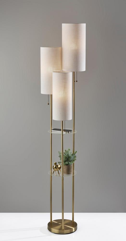 Embrace form and function with the 68" Trio floor lamp. Featuring two 10" round clear acrylic shelves, this lamp provides storage and display opportunities. The bottom shelf has a clearance of 32", making it ideal for displaying vases, picture frames, or other taller items, while the 18" clearance for the top shelf makes it a perfect place to set your phone, remote control, or other smaller items. The 10" diameter round metal base with an antique brass finish makes for a sturdy design, while the three poles with an antique brass finish arranged in a triangular pattern rise cleanly to three tall drum shades of varying heights and diameters for an eye-catching design. The three drum shades are crafted of cream-colored textured fabric to softly disperse the light from 40W bulbs, and the bulbs can be operated separately with pull chain switches, allowing you to control the amount of lighting.